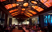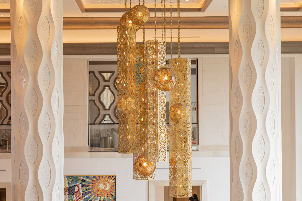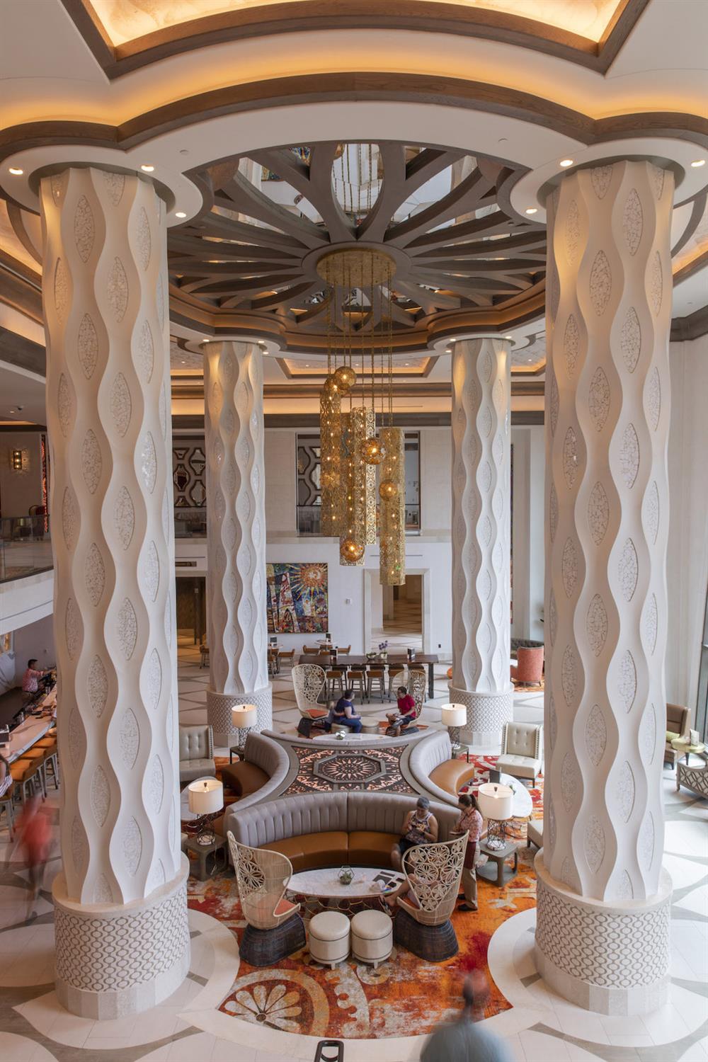 A magnificent chandelier framed by sculpted plaster columns shines in the lobby of Gran Destino Tower above Barcelona Lounge. Gran Destino Tower at Disney’s Coronado Springs Resort opens July 9 at Walt Disney World Resort in Lake Buena Vista, Florida. (Steven Diaz, photographer)