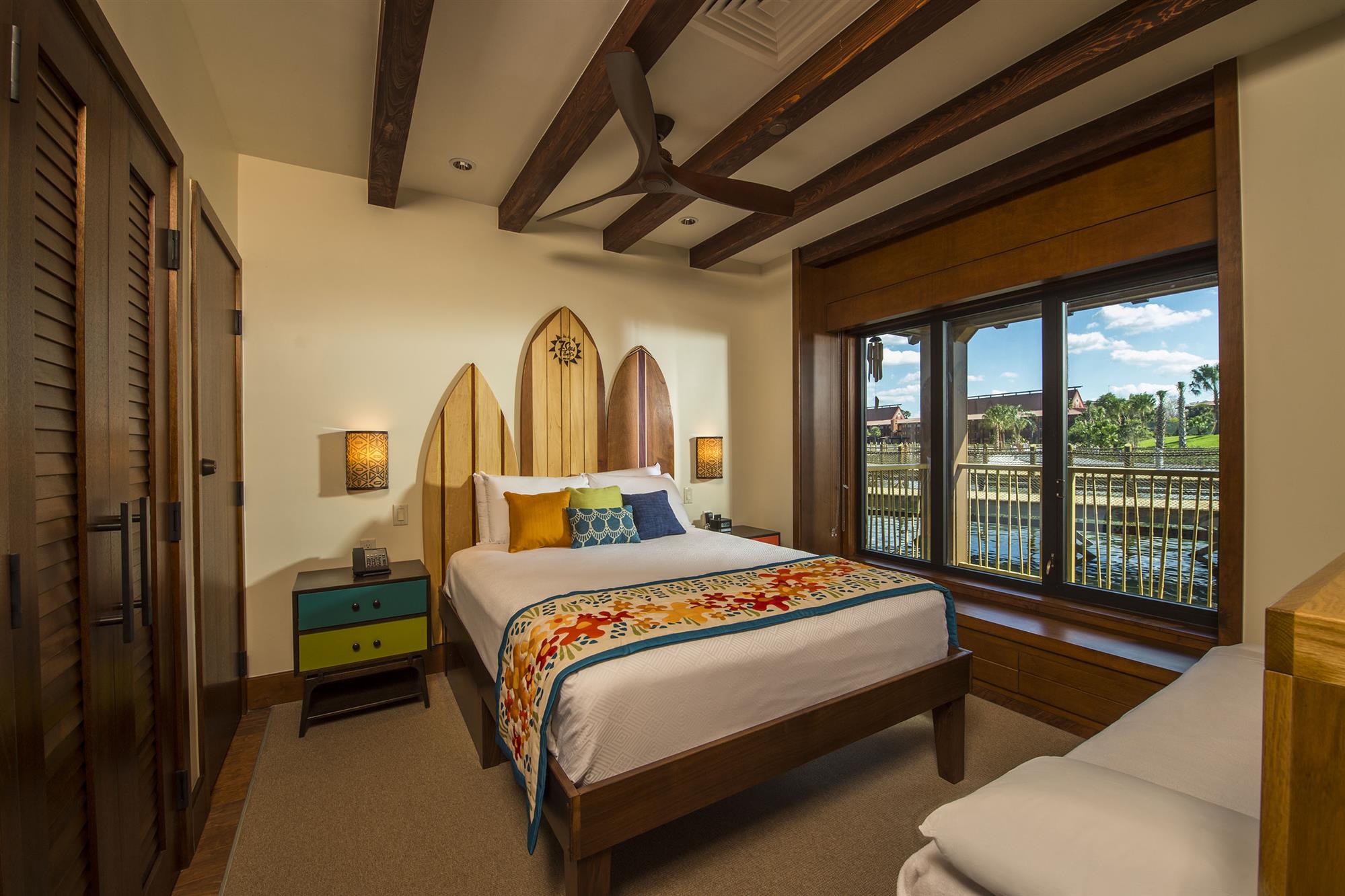 Resort Features: The Polynesian Village Resort is a tropical paradise that features two pools and two Restaurants, including Ohana, a world-class Restaurants overlooking Seven Seas Lagoon.   Standard room amenities: Alarm clock with MP3 player, balcony or patio, ceiling fan, coffee maker & setup, hair dryer, ice bucket, in-room safe, iron and ironing board, table & chairs, telephone with no surcharge (charges for long-distance will apply), television, USA Today Delivery (Mon-Fri), vanity area, voice mail, Wi-Fi wireless internet