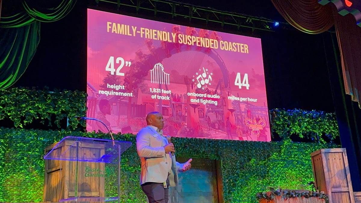 Erick Elliott, Vice President, Engineering then came out to share some new details about Phoenix Rising, the new family suspended roller coaster opening at the park next spring. A new rendering of the coaster’s layout was revealed, winding through the Pantopia area of the park. The coaster will also feature onboard audio and special lighting.