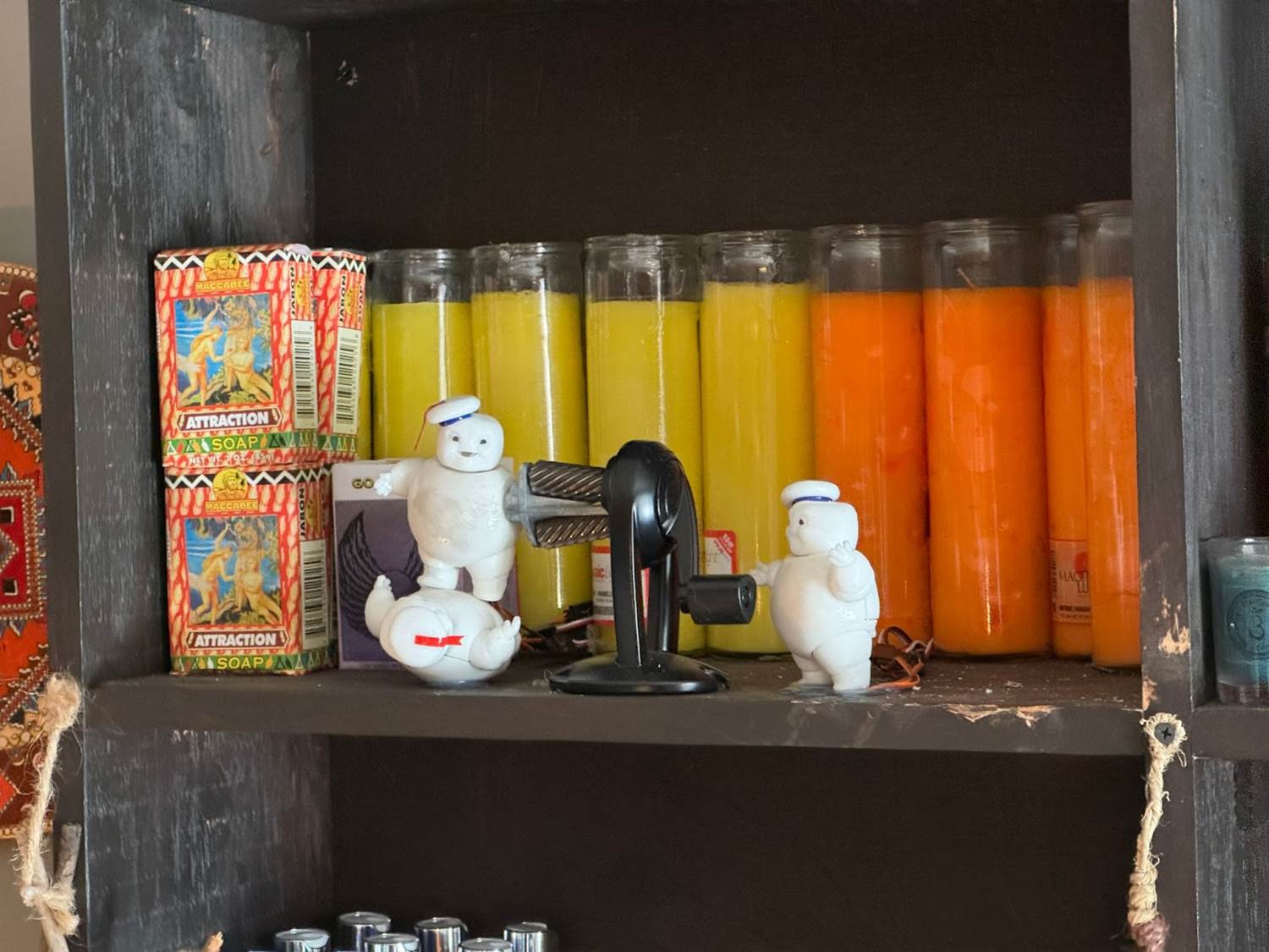 “Obviously this house is based on Ghostbusters: Frozen Empire," John Murdy began, “but it has callbacks to a lot of the other films in the franchise as we're going [along], so you kind of get the best of both worlds. Last time we did [a ‘Ghostbusters’ haunted house, the firehouse was the facade. This time we decided to do Ray’s Occult bookstore, so that's what we're standing out in front of. There's a whole pre-show that happens while you're waiting in line. The Taxi Driver Ghost animated figure is going to be inside the taxi cab and then you can Slimer inside [the hot dog cart]-- every once in a while he pops up and he's got the hot dogs in his mouth. You're hearing Ray, Dan Aykroyd's character, talk about the Death Chill and set up the story, and then we go inside Ray's. And what's crazy is there's stuff in here that's from Mummy movies. There's stuff in here from all kinds of different movies– stuff we've acquired over the years. The Mini-Pufts are all animated; it was just a little science project because they were really small, so we got the 3D model for them."