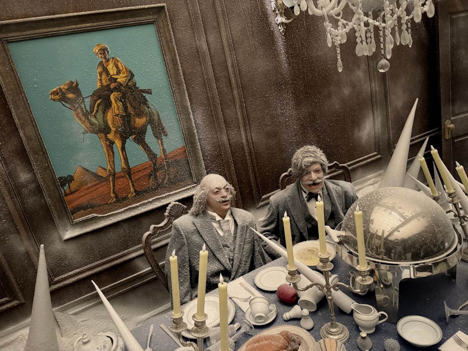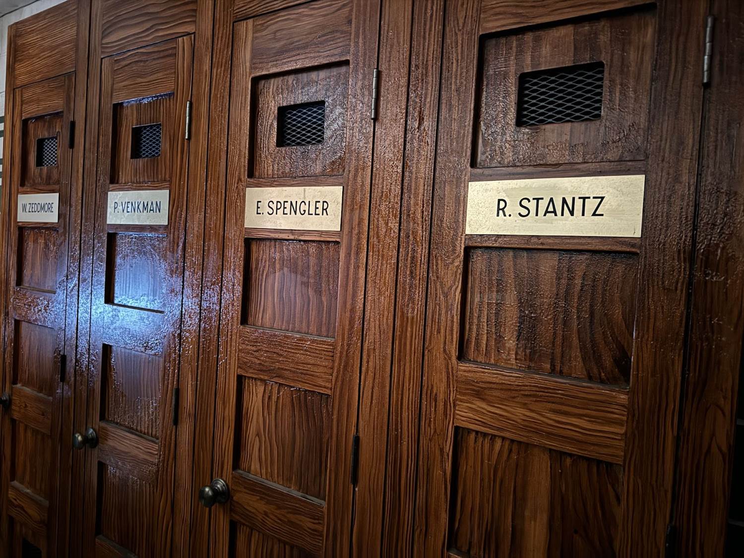 “And then we designed them so that there's five tiny little servo motors inside there– the kind of stuff you'd use for high-end model train stuff. The guy with the parasol pops up out of that cup, the one inside the book– his legs are kicking, there's the guy there sticking his hand inside the pencil sharpener, and that's all animated. So [there are] lots of lots [of them], and then the ones on the lamp, too, turning it on and off. Lots of animated figures. In this scene we have Ray Stantz, and he's behind the counter. He's on the phone talking to the New York librarian about the Death Chill, and Podcast’s his partner in the new movies– [he] comes around the corner with the Hammer of Truth. He's gonna smash the Mini-Pufts, but you're in his path… so he's the scare. And then we're making this whole wall disappear and you see Nadeem’s secret room from the new movie, which has all that armor there. And then from there, we have to take you back 100 years. There's a line in the movie where the librarian says this happened 100 years ago."
