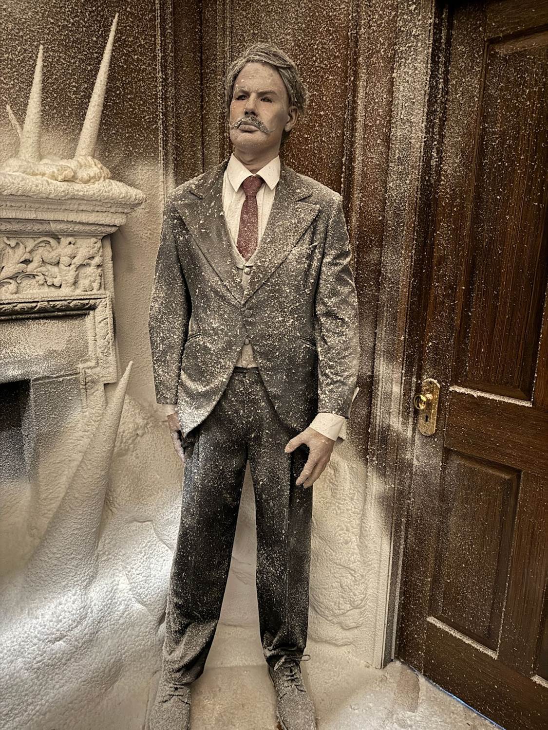 “People froze to death in the middle of July– I think it's in the trailer. And so we thought, ‘Oh, that would be cool.’ And there's that prologue in the movie where they go to the Manhattan Adventurers Club and all those people are frozen, so we wanted to do that in the house. So if you turn the corner, [there] is just gonna be a giant 100-year-old newspaper telling you about how New York froze over 100 years ago. And then Garraka, who's the bad guy in the new film, comes bursting through the poster and sends you on into the Manhattan Adventures Club, which we just flocked [with fake snow]. [There] are the two performers in this scene: there's a guy in the room with makeup on that looks like he's one of these frozen guys, but he comes to life, and then there's a New York fireman who comes through that door over there just watching. And then from here we're gonna [see] a little bit of a throwback to Ghostbusters 2. We're gonna go into the sewer with the pink slime."