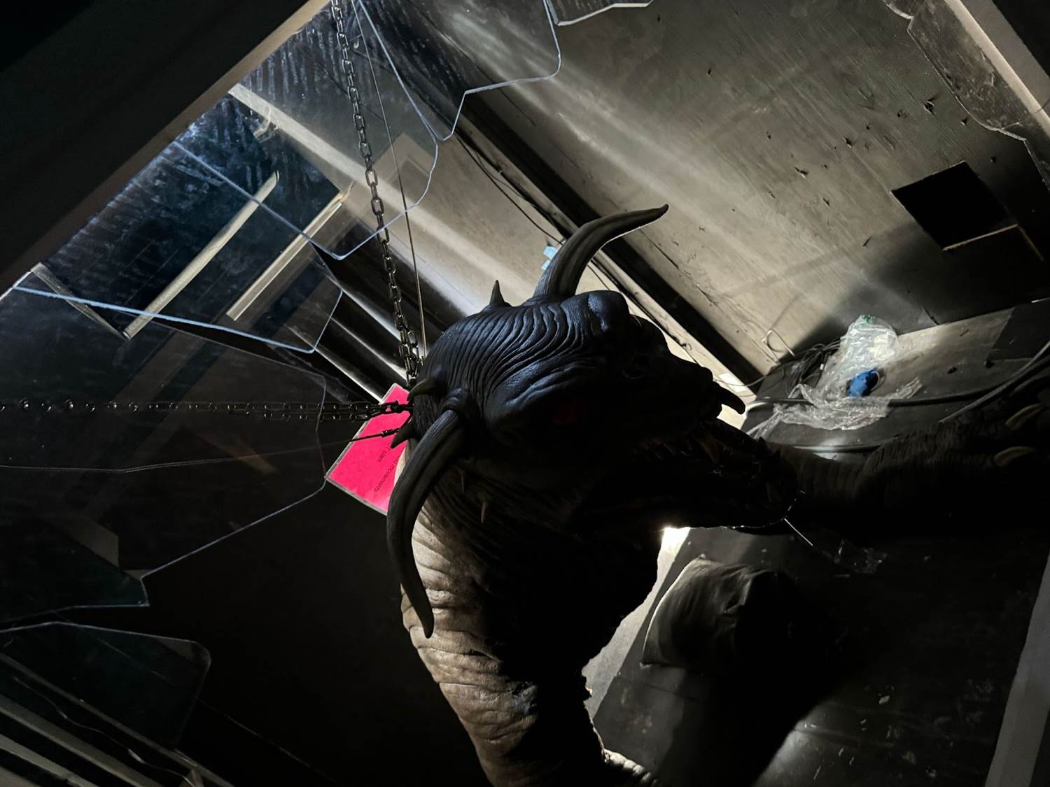 “We didn’t do that last time, so we thought, ‘Oh, that's good.’ It's a little dark, hard to see, but there's pink slime everywhere. There's another Mini-Puft that got lost and he's riding a rat like a bucking bronco. Then as you're going through the sewer, as soon as you step through this curtain, you get attacked by the Miner Ghost, which is actually from the movie [Ghostbusters:] Afterlife. And then you run into the Sewer Dragon. I think that's the only thing that's not physically here right now because my makeup artist is busy painting it– it's massive. So the whole thing tracks forward, and then we take you into the Ghostbusters’ new lab which is overrun by many [Mini-]Pufts. These are fun– we have the coffee cup that spilled and melted one of them. The hand and the head are animated. Then we have a cannibal one toasting his friend on the Bunsen burner like it's a S’more, and then we have the other ones with a laser. That's actually all lights up. They're shooting a hole through their friend with a laser, and then this is actually a turntable where there's one guy trying to run away from two other ones that are trying to kill him."