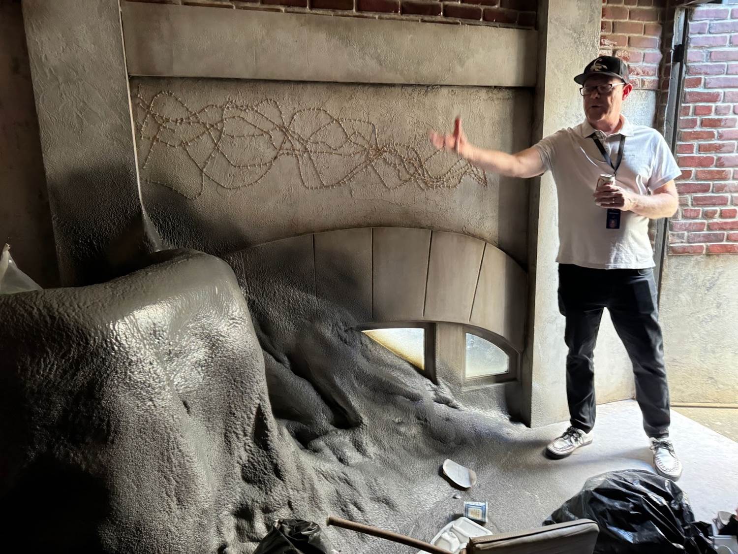 “There's lots of things going on in this room behind you. [There’s] gonna be [a] big portrait of Vigo the Carpathian from Ghostbusters 2– that's gonna be a scrim, so we light through it on the trigger and you see Vigo on the other side as a bang window. And then Lars, who works in the lab in the new movie, comes running out of this door and he's covered in Mini-Pufts. Then Lucky, who's one of the characters from the last two films, [is] over here freaking out because her friend Phoebe is inside the ionic separator, and she's had her spirit taken out of her. [There are] A bunch of special effects, lighting effects and smoke. The new lab that the Ghostbusters built for Frozen Empire is inside an old aquarium, so there's all these aquarium tanks which gave us a great excuse to do a hallway with just tons of different scares and characters from different films. The library goes from the original film [appears again in] the new film, and then the Terror Dog. Then we come to the firehouse [facade], which is as small as possible. Garraka now comes around the corner, and he's a stilt-walker, so he's the scare– he's got horns out to here. And then he drives you inside."
