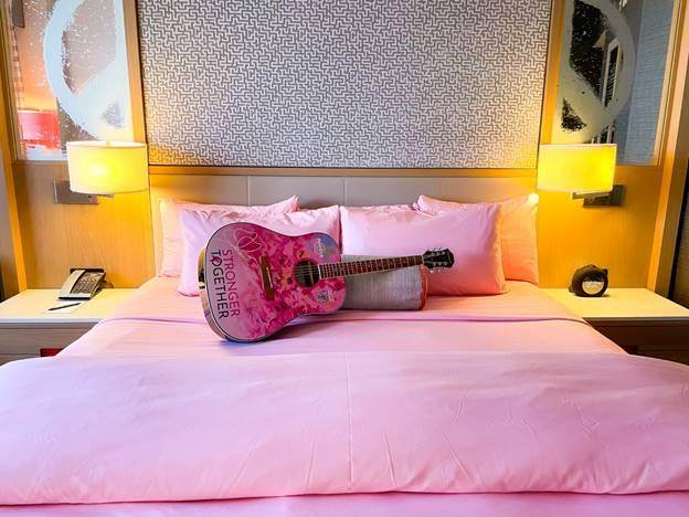 - Pink co-branded Gibson guitars are available for guests to borrow and jam out in their room.