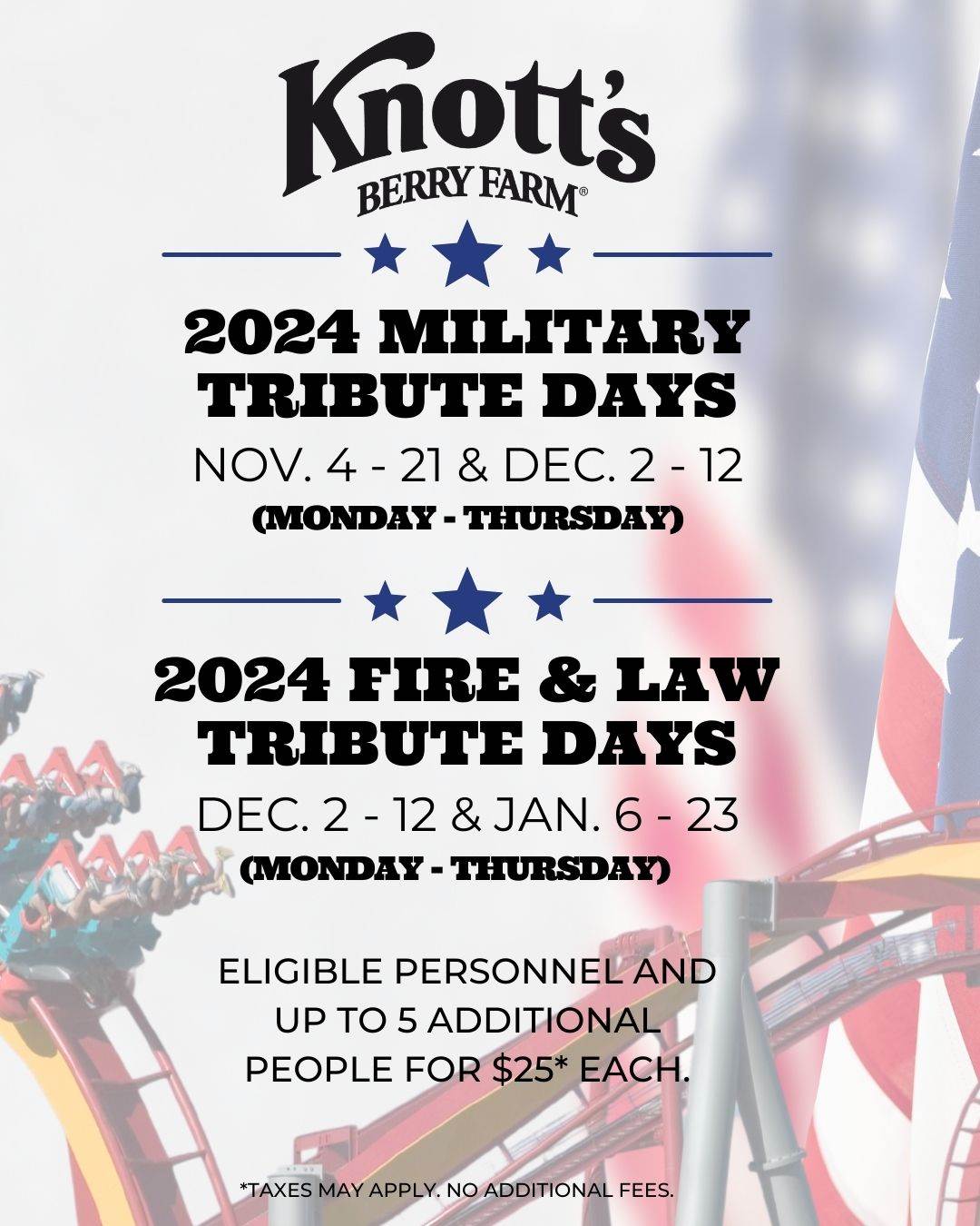- Knott’s Berry Farm has announced the return of their Military Tribute Days and Fire and Law Tribute Days.