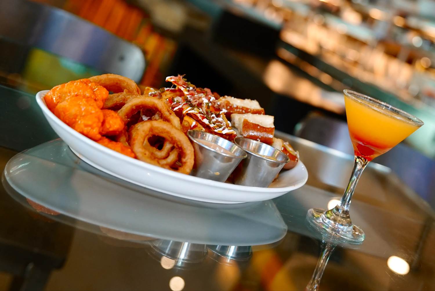 - Champions’ Sampler – A sharable plate featuring boneless wings, onion rings, BBQ Nachos, Pretzel Bites with Queso and Champ dipping sauces (above)