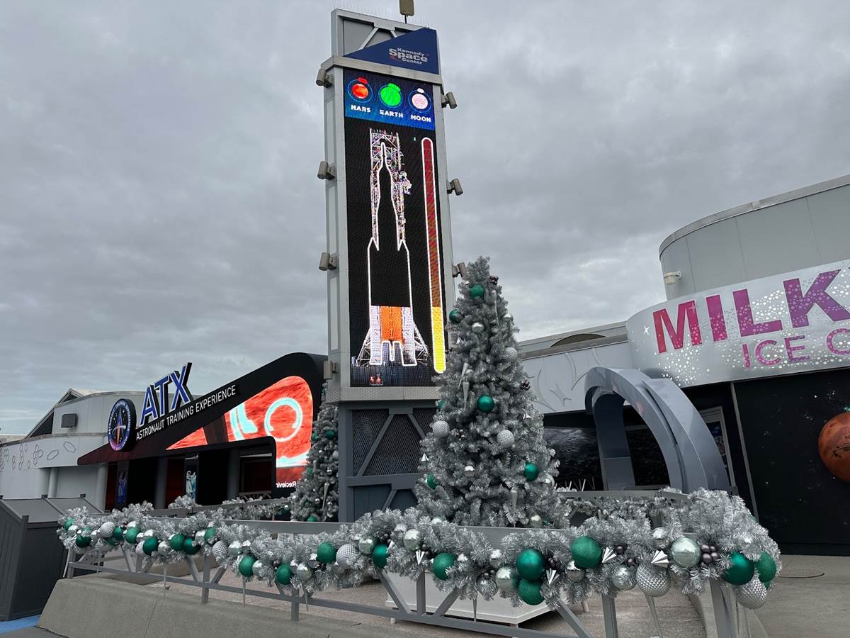 The main 50-foot tall Christmas tree for the event can be found just outside of Gateway: The Deep Space Launch Complex.