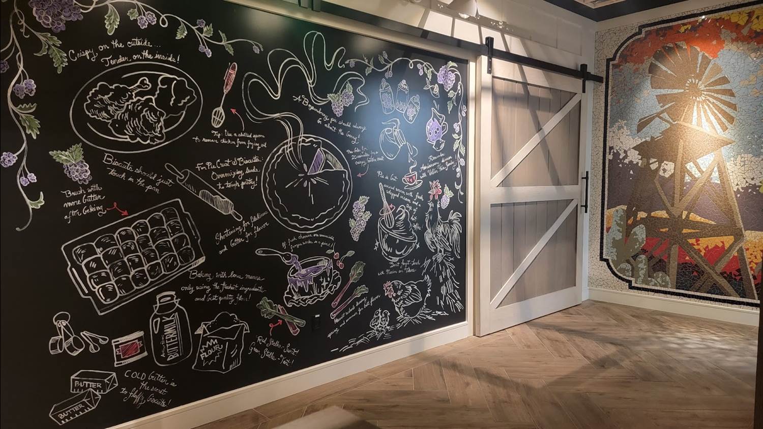 Guests begin their experience in the Knott’s Hotel in the lobby, which here is known as The Great Room. It was designed to give the feel of your home living room looking into the kitchen. Lots of boysenberry-inspired decor, as well as photos of Walter and Cordelia Knott can be found throughout The Great Room. There’s also quite a bit of china to be found, as when Mrs. Knott’s Chicken Dinner Restaurant first opened, Cordelia Knott used her own wedding china for diners.