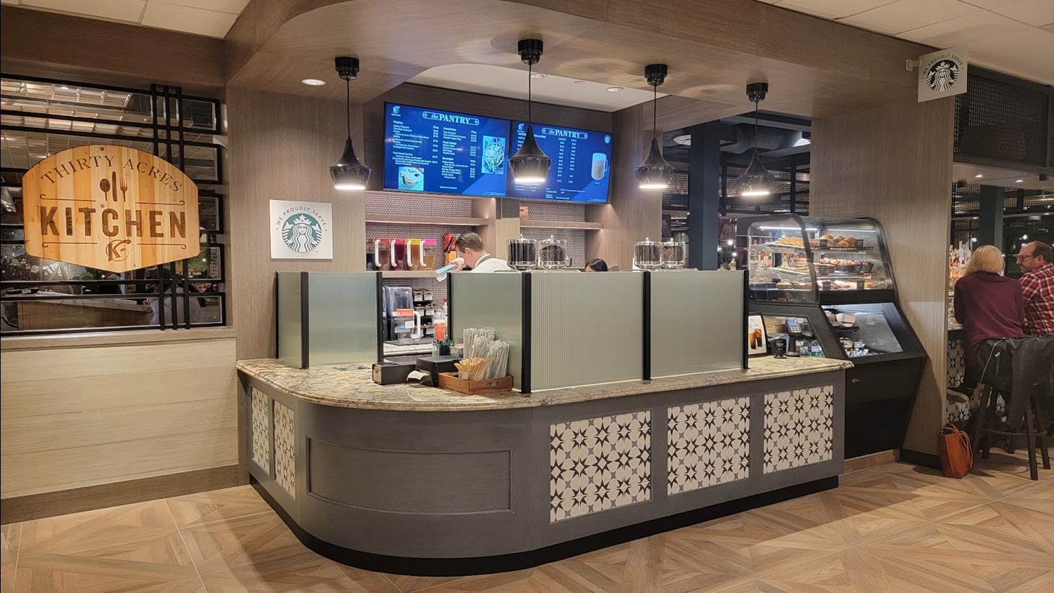 Just outside Thirty Acres Kitchen is a new coffee bar, The Pantry, featuring freshly brewed Starbucks coffee and grab-n-go items.