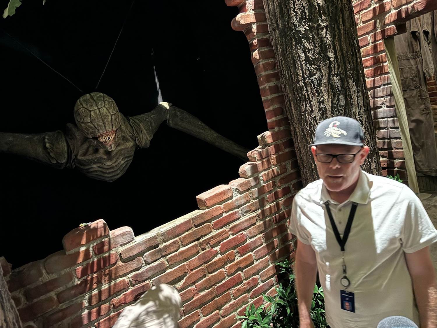 “And that's gonna be reiterated by our performers, so we rehearsed this house a couple of nights ago as part of our performer training or scare actor training. We brought in experts to teach not only the character playing Reagan but other characters in the house simple ASL phrases that I wrote and then we translated into ASL, so that's what they're gonna be doing in the house. This is the first time we've ever done anything like that; it's just to be true to the film. And then lastly, it's the creatures. You know, A Quiet Place kind of violates one of my key rules with Horror Nights when I'm looking for any property. I'm always looking for three things: awareness. Do people know it? Do they want to come see it? Second, does it have characters that could be translated to live performers and A Quiet Place is pretty much a ‘no,’ because the threat in the film are the creatures and none of them are human-shaped– they're huge and they move around on all fours, so we knew that that was gonna involve special effects. Last year we did a house with Chucky and that was kind of the test case to see if we could actually do fully animated figures… I think we built 17 of them for ‘Chucky.’"