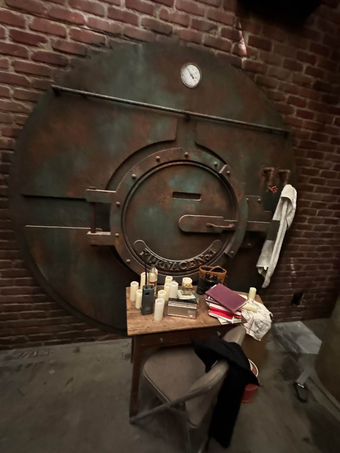 And she gets the idea of, ‘Wow, if I can amplify and broadcast the sound from my cochlear implant, maybe I can take care of these creatures.’ So she leaves and goes to do that, but she leaves Marcus in the foundry and there's a scene where Marcus confronts the creature. Once Reagan starts broadcasting a signal with the boom box– that's what we're recreating. What he does is he kind of comes out of that pipe and then holds up the boom box and the plates start going crazy and he retracts back inside the pipe. This is kind of a presentational scene too. This is our final scene in the house, but as soon as you step through the curtain, there's one more scare– one more deaf angel and one more creature to get you.