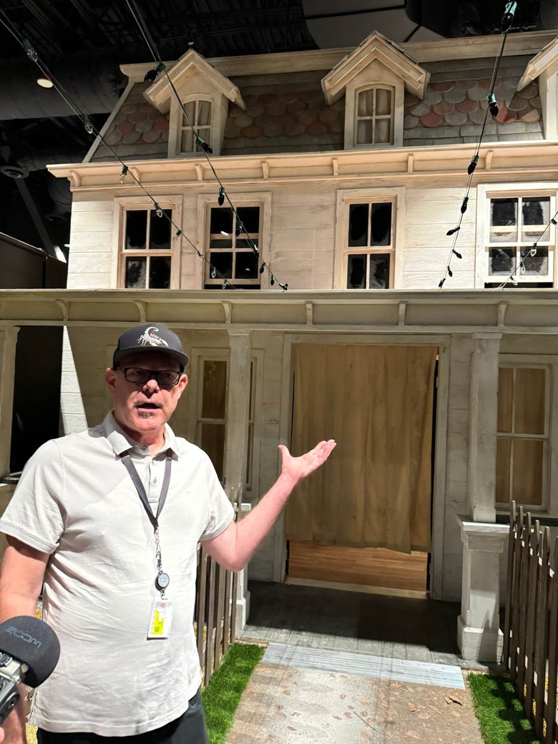 “But here in ‘A Quiet Place’ now we have to upscale that. So again, we worked with our internal mechanical engineering department here in the park that works on all the rides and attractions, and there's ten creatures in this house. Six of them were puppet effects [and] four of them are fully animated figures, and so I'll show you those as we're going through. The third thing is environments– we're looking for environments that we can replicate in a live experience, but particularly a variety of environments. This house is based on A Quiet Place 1 and 2, so there was a wealth of different environments to choose from. Where we start the house is as you're in the woods, and this is just a detail we went to that is very much a part of the movie. Lee, the dad, pours down these trails of sand in the woods for his family members to walk on so they don't make noise. So under your feet all the way through this forest section [are] floor graphics to convey that the character of Regan is the first character you meet in the house. She'd be standing roughly where I am."