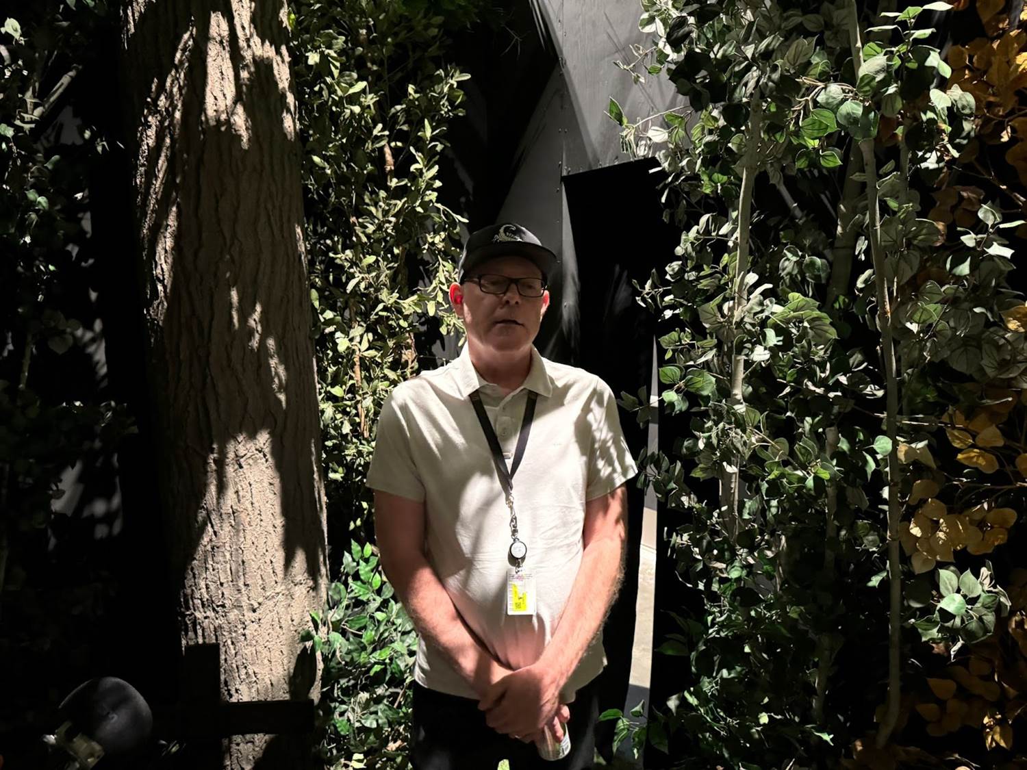 “In the film, Lee and Marcus– the son– were off on an expedition and they come across this old man in the middle of the woods and his wife has just been killed by one of these creatures. And the old man looks like he's about to unleash this horrible scream and they're like, ‘No, no, no, no, no.’ And then he just goes, ‘Aaaaah!’ and then instantly the creatures come, so that's what we're doing with this scene. Where I'm standing is where the old man performer would be, and then when I was talking about near field audio design, this is what I'm talking about. All of these trees were custom-built for this attraction purely to house speakers. Under show lighting, you don't see grills like you're seeing them [now, and] the two bushes back there are [also] hiding speakers. So we're finding all these different ways of bringing the audio really close to you, because as soon as this performer hits his trigger, we kick in a surround sound effect of the creatures coming from all directions and converging on you."