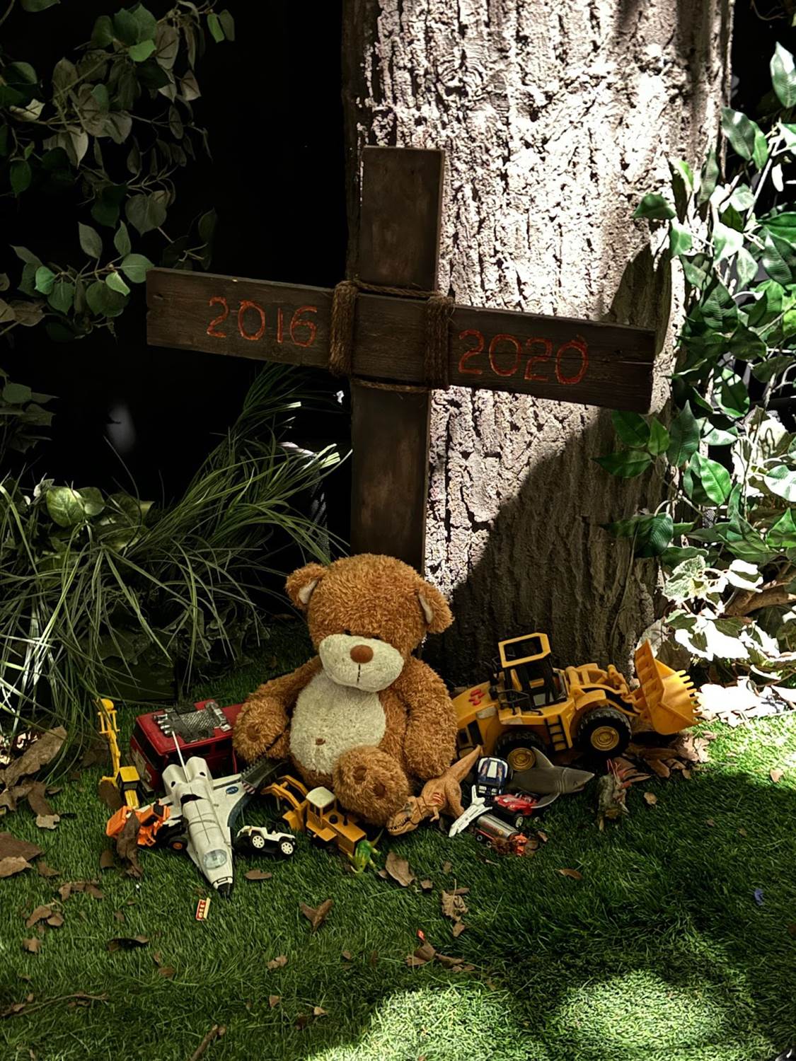 “The youngest son picks up that space shuttle prop, and it starts going off in the woods and the creatures come and he gets killed right in the beginning of the film– it's a shocking beginning to the first film. So we're at his grave, Reagan is at his grave; there's the little space shuttle prop that's a special effect. When we were looking at how to deliver what the film delivers, we looked at all sorts of different things, but the one thing we knew for sure is our guests aren't gonna be quiet. We're gonna keep reiterating that all through the queue line and our characters are reiterating that with ASL, but we know our guests– they're gonna make noise. So we're gonna punish them for that. All throughout the house, there [are] little cause-and-effect triggers– if a guest passes through what we would call a banner sensor or a beam, it triggers something to happen, which in turn triggers the creatures to come. In this scene, [when] you get to a certain point, you trigger that space shuttle prop, it starts making noise, the lights start flashing, and then immediately you start hearing the creatures coming, which is the next scene."