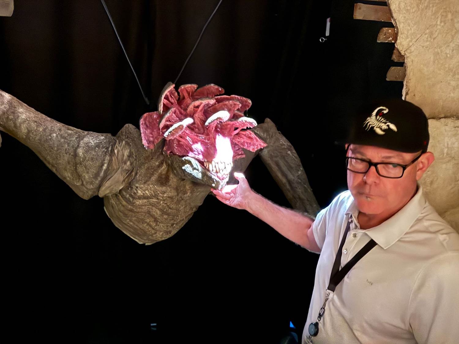 “As soon as we get to this point, once the creatures start making noise, we pass through this curtain and we immediately run into the first [one]. This is a puppet. The performer can make the mouth open. There's ten of these in the house, [and] these are all built by Patrick Magee and Magee FX, which is our long time makeup artist that works with us. We started with all these behind-the-scenes elements we get from the film, so we have all these technical drawings of this guy. We blew it up really big and put them up on the office wall, and then took different people from our team and stood [them] next to it just to try to figure out what size was gonna work. While Horror Nights was going on last year, we did a whole audio mockup while the event was running in our facility to test out the near field audio design and see if that was gonna be the way to approach it. I started in March working with my counterparts in Orlando and some folks on our marketing team to curate the slate for the following year."