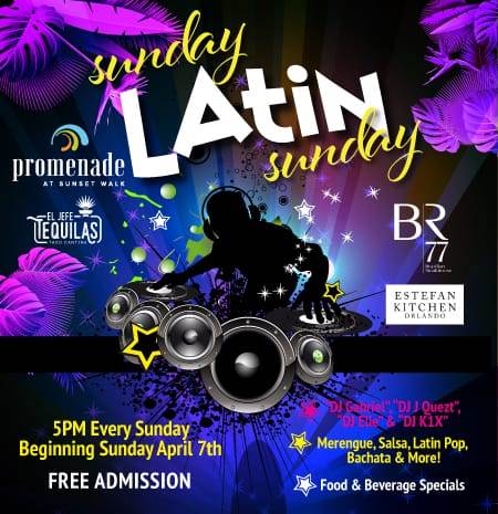 - Join in every Sunday evenings starting Sunday, April 7, as the Promenade at Sunset Walk, El Jefe Tequilas Taco Cantina, BR 77 Brazilian Steak House, and Estefan Kitchen Orlando present Sunday-Latin-Sunday on the Promenade Plaza Stage, starting at 5 PM.