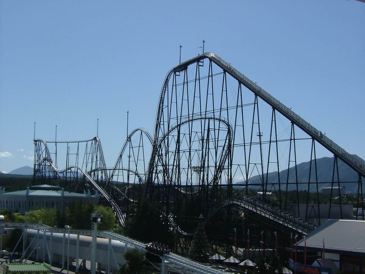 In July of 1996, Fuji-Q Highland unleashed Fujiyama. Translated in English as King of Mountains/Coasters (many languages refer to coasters as Russian Mountains), the Togo manufactured giant took the record for both tallest and fastest full-circuit coaster in the world at a height of 259.2’ and a speed of 80.8MPH. It was also dubbed the first hyper-twister, which means it features a more compact and intertwining layout compared to the out-and-back designs of other hypers.