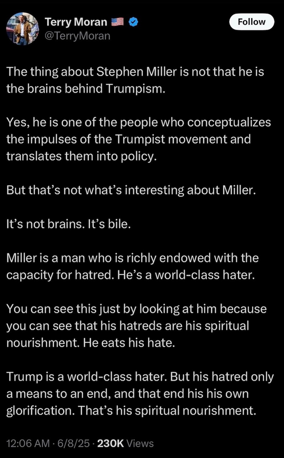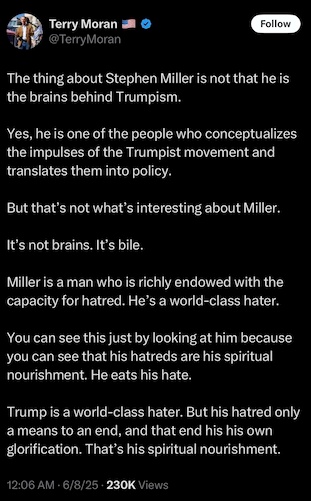 - Deadline reports that ABC News has parted ways with senior national correspondent Terry Moran for a recent X post targeting Trump administration official Stephen Miller.