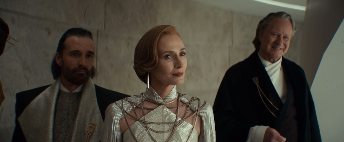 Syril says he wants to delay something that he’s dreading the following day, though Dedra says they can’t cancel again without revealing what’s happening. On Chandrila, Mon Mothma is dressed elegantly for the wedding banquet, and finally finds a moment to talk with Tay Kolma (Ben Miles) while Luthen watches from the other side of the room. Tay admits to Mon that he’s been having a difficult time. “I have concerns," he says. “The foundation is up and running. Everyone seems quite pleased with how they’ve landed, and I’m left worrying about the risk I’ve taken on. Rebel activity soured my investments. You can see how I might feel undervalued." Mon says she regrets not knowing about this sooner and promises Tay that they’ll have a meeting the following week on Coruscant, though Luthen appears not so certain about the outcome. On Mina-Rau, our heroes discuss strategies to evade the Imperial inspection with the farmers who have taken them in, and on Coruscant we see Kleya enter Luthen’s antique shop and start up the covert communication device in the back room.