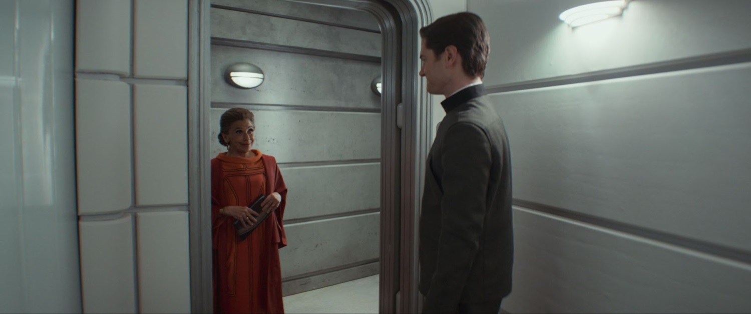 On Mina-Rau, B2-EMO is distraught to find out that Brasso is going away temporarily, though he’s being left with Talia (Claire Brown). In Bix’s hut, she fiddles with a communicator hoping to receive a message from Cassian, but Brasso enters and tells her it’s time to move. Unfortunately neither of them know where Wilmon (Muhanned Bhaier) has gotten off to– hint: he’s saying goodbye to his girlfriend Beela (Laura Marcus), who is surprised to find that he’s armed with a blaster– so Brasso takes off after him on a speeder. The Imperials arrive and demand that Talia serve them meals, as the officer notices Beela and her mother demands that she get inside and stay there. We see Wilmon and Brasso racing toward each other, and then we cut back to Chandrila, where the conversation between Luthen and Mon ends with him implying that Tay Kolma will have to be killed. “I’m not sure what you’re saying," says Mon. “How nice for you," replies Luthen.