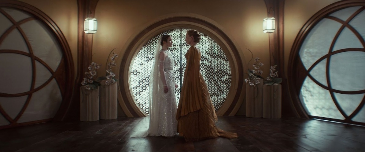 She also tells Leida that her own mother was drunk when she got married in the same room. “I was so angry I don’t think I ever forgave her." Mon insists to Leida that she doesn’t have to go through with the wedding: “None of it matters. We can walk out there right now and tell them it’s not yet time for a marriage. We can put it off, and it will be remembered as an act of great bravery, I promise you. You do not have to go through with this." Leida responds with the most devastating line in the episode: “I wish you were drunk," which clearly deeply hurts Mon’s feelings, though she manages to pull herself together to lead Leida out into the area where the ceremony is to be held. We see some interesting Chandrilan wedding traditions play out, and then the two young fiancees step into a large circle, followed by their four parents, walking around them rhythmically. The groom is given a ceremonial knife by Perrin Fetha (Alastair Mackenzie), which he uses to cut off Leida’s braid, much like a Jedi Padawan would have their own braid severed when they were promoted to Jedi Knight.