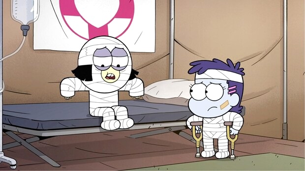 While she is trying to get the kart to stop, she hits a rough patch in the track that has rocks causing her to bounce and her knee to hit the boost switch. She takes off and rockets ahead of the other racers and into the sky, getting airborne as she goes over the finish line. The tank explodes and the kart rolls with Tilly in it. Don’t worry she’s mostly okay, as we see moments later as Frank is finishing up the last of the body cast tape wrapping her up too.