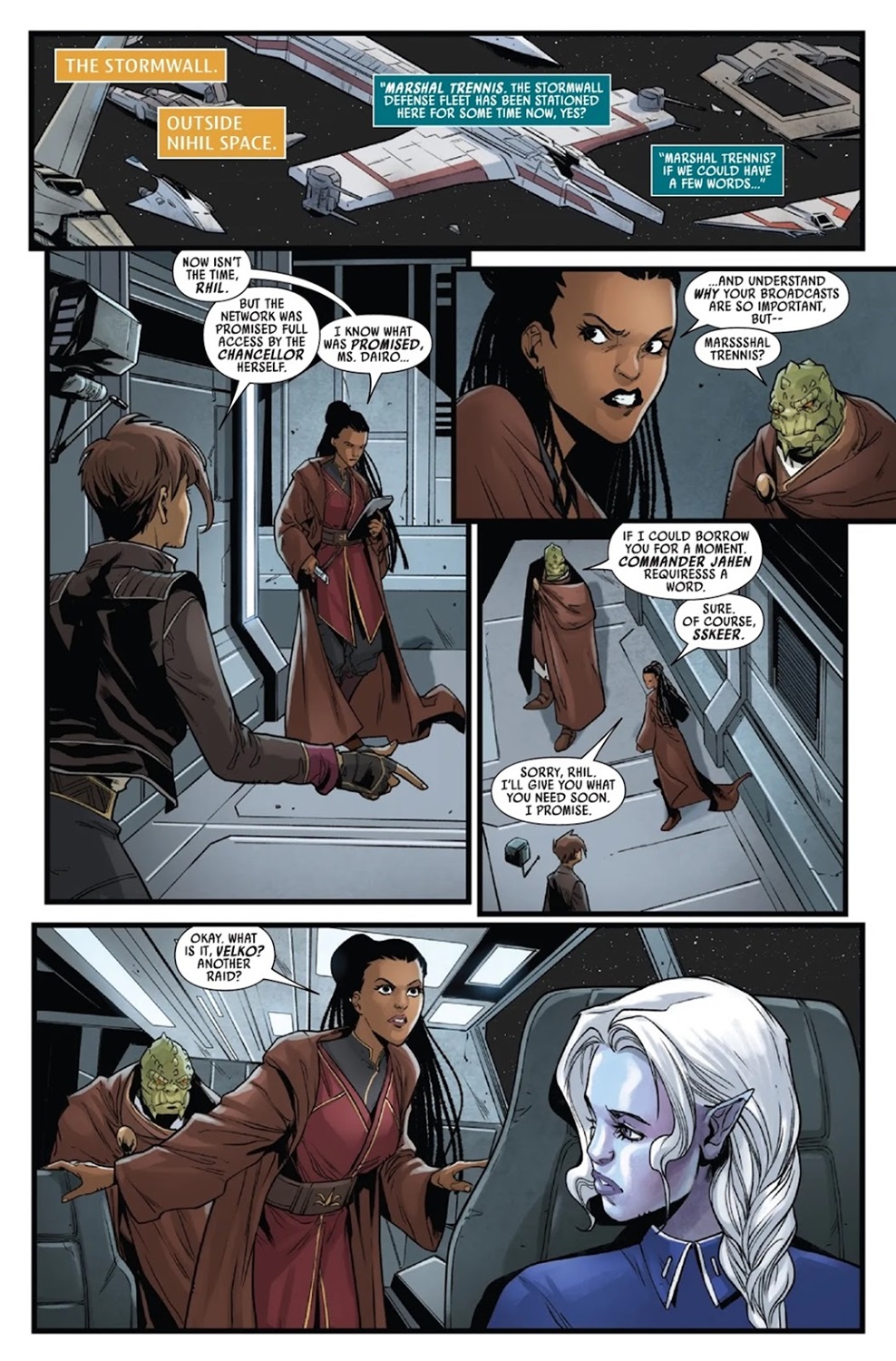 The High Republic - Fear of the Jedi #2 begins outside of Nihil-controlled space aboard the Republic longbeam Gios. Marshal Keeve Trennis is frustrated by having to deal with the GoNet reporter Rhil Dairo, so her fellow Jedi help her out by calling her to the bridge, where they soon discover that the Stormwall dividing the galaxy has suddenly disappeared. We saw that same major event happen (from a different perspective) last week in the pages of Dark Horse Comics’ Star Wars: The High Republic Adventures, but we still don’t know who or what exactly brought the Stormwall down. I suspect we will discover more about those circumstances in an upcoming novel, but for now it’s enough to know that the Republic fleet has access to the Occlusion Zone.