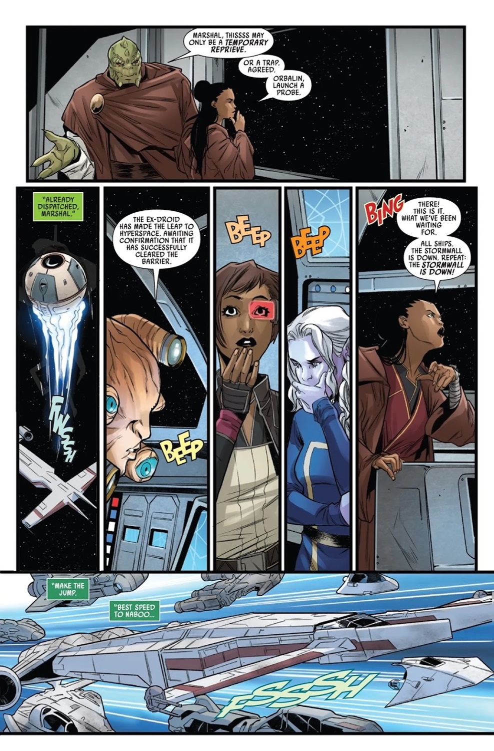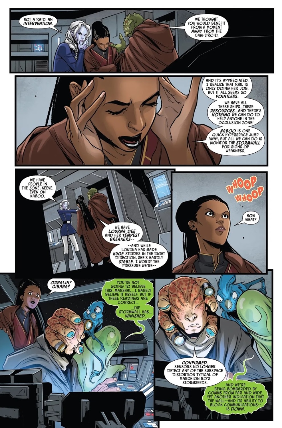 Keeve and her squadron use that fortunate turn of events to jump to Naboo, where we cut to Lourna Dee and her group of “Tempest Breakers" as they confront fear-fueled visions conjured up by the Child of the Storm Sister H’Tar. Lourna fights her own mirror image, as she appeared when she was still a Nihil Tempest Runner, while the others see Marchion Ro and a Nameless creature who are both not really there. Meanwhile in orbit above Naboo, Trennis jumps into a Jedi Vector starfighter and joins other members of the Order in space as they battle Nihil ships and scav droids. On the surface below, ordinary citizens of the planet begin fighting back against the Nihil as well, knowing they now have Republic support. The Tempest Breakers are indeed able to break free from their visions and expose H’Tar, but as soon as they do, the Nihil begin retreating into space for unknown reasons.