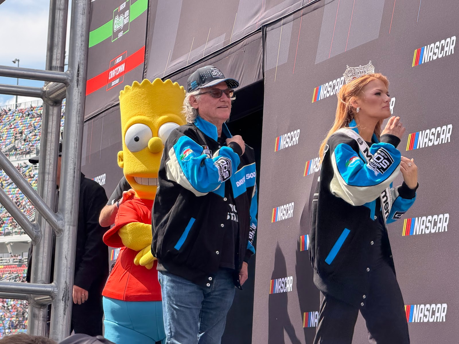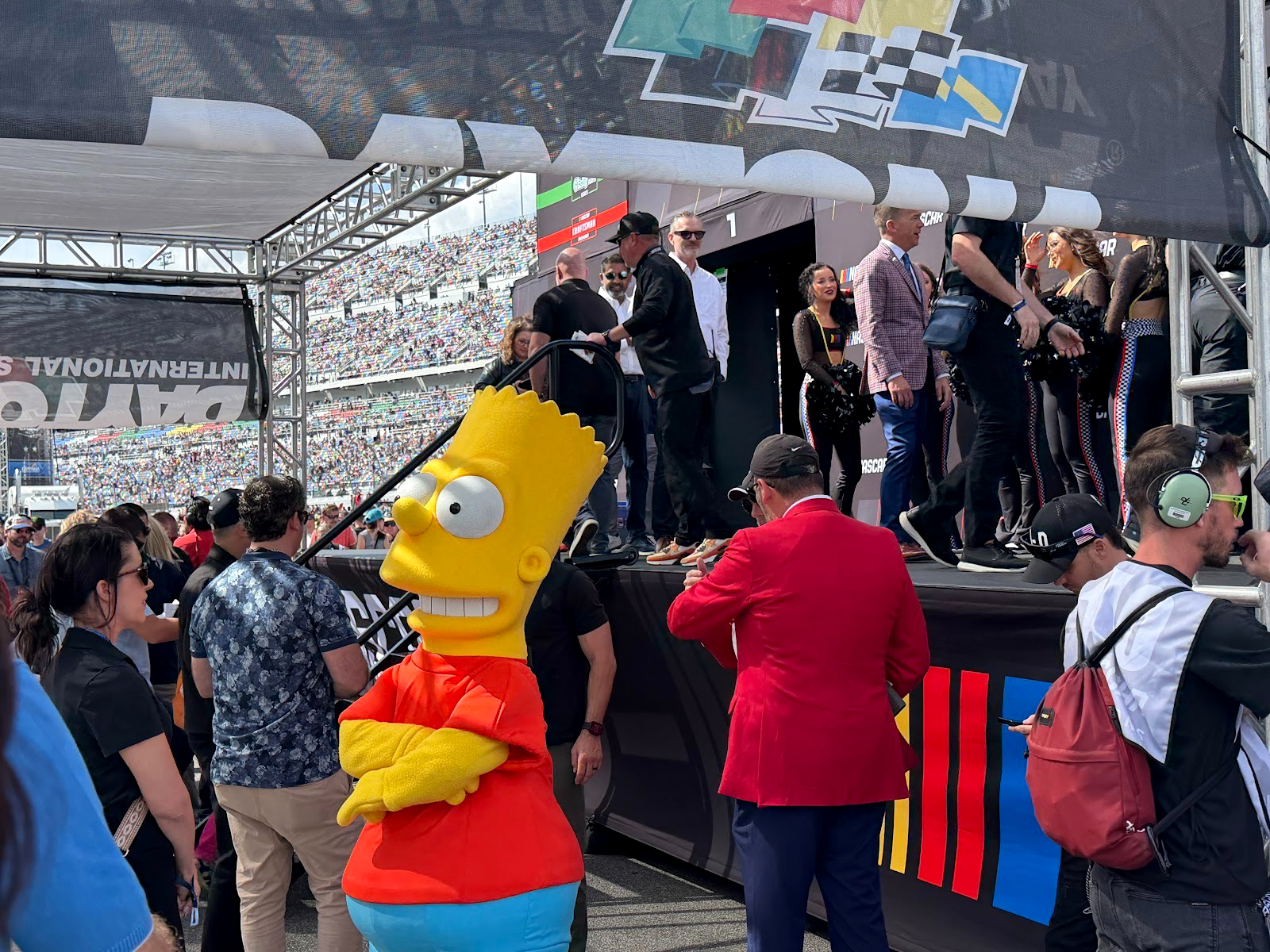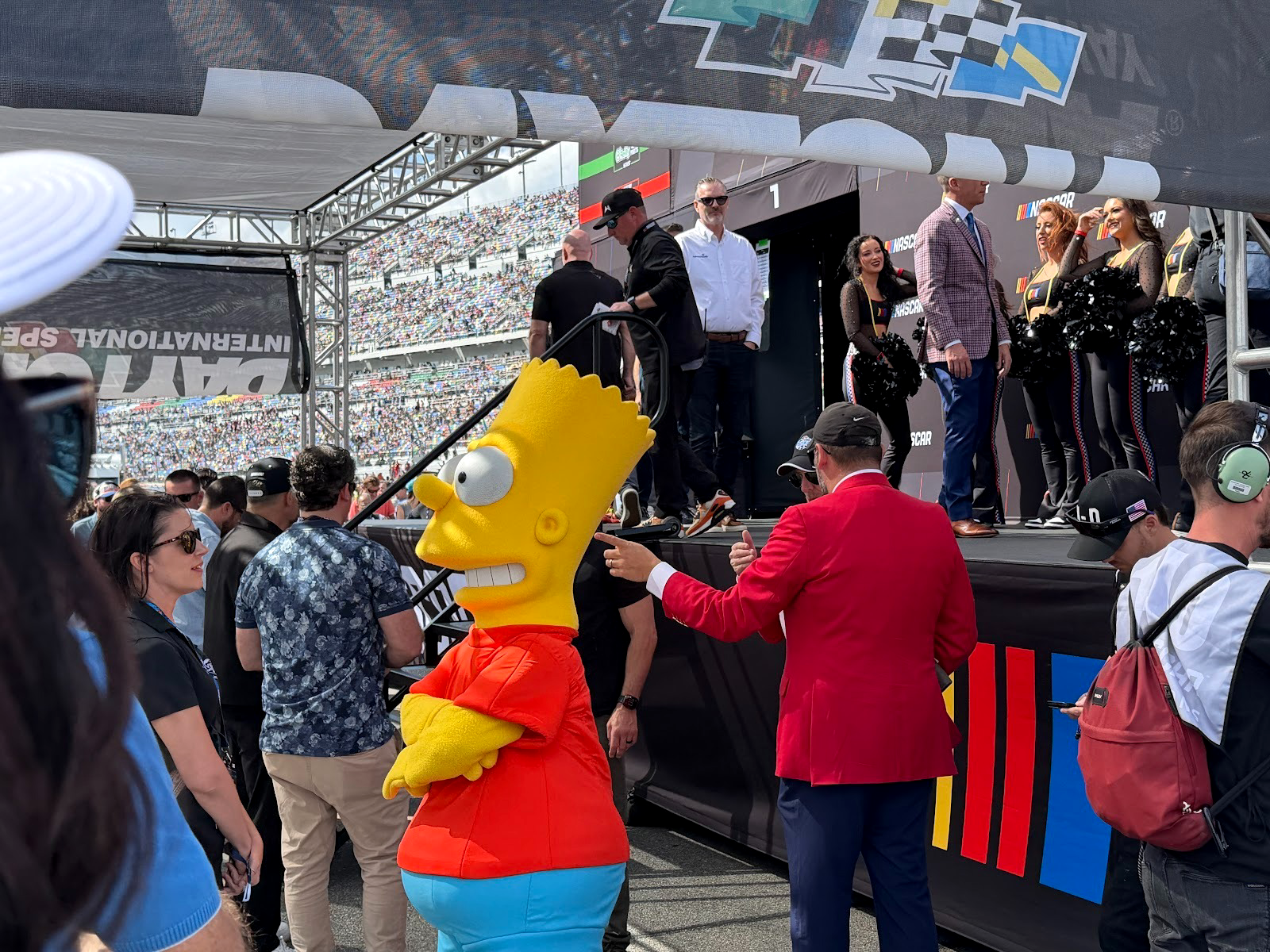 Also serving as a friendly reminder, Bart Simpson was on scene waving the green flag at the race today, since the 800th episode of The Simpsons will be airing on Fox tonight after the coverage of the Daytona 500. Bart Simpson appeared with handlers from Universal Studios Florida, as that is where the character makes appearances not far from the Daytona International Speedway.