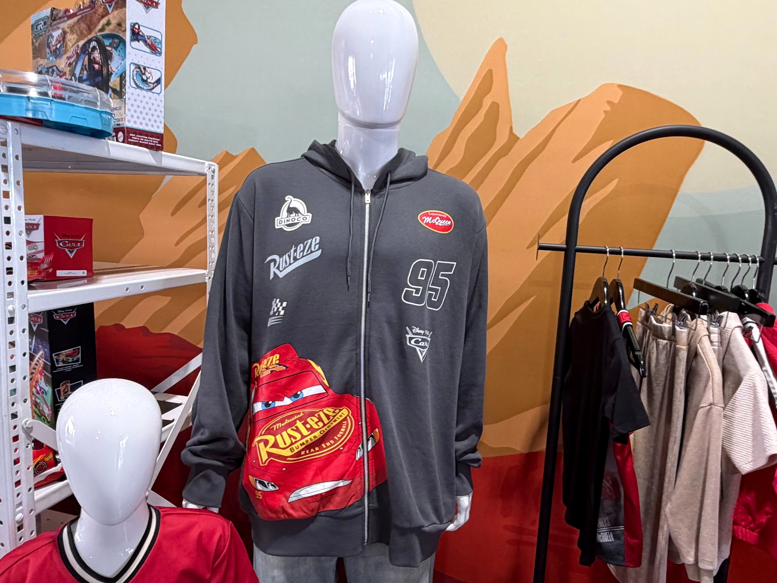 And of course, there's plenty of apparel that Cars fans can get their hands on like this zip hoodie featuring Lightning McQueen, and his Rust-Eze Sponsor, and other special iconography. In fact, a lot of that art and imagery was seen throughout the pop-up.