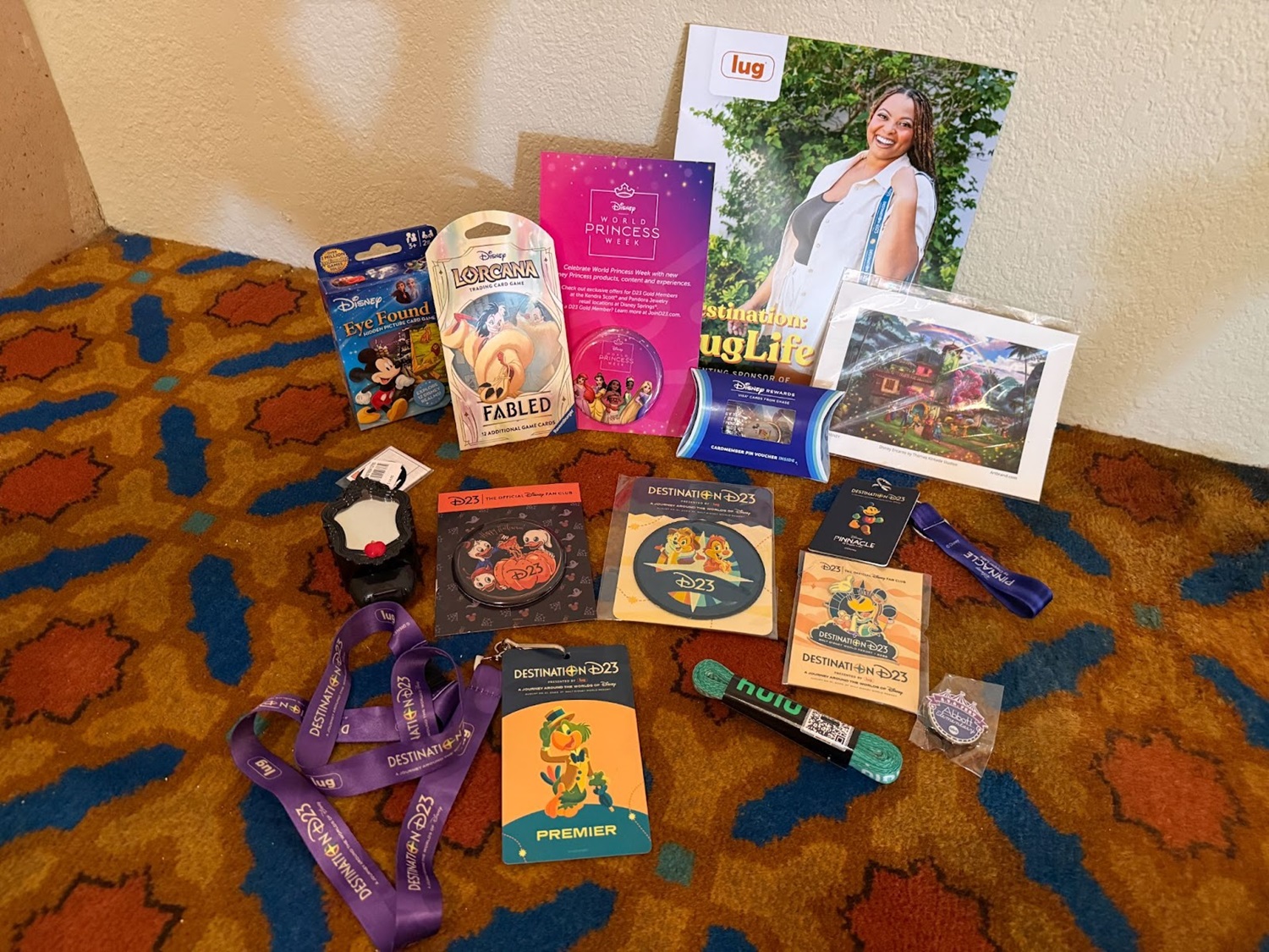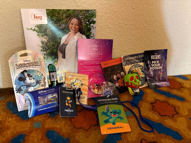 Among the items included in the gift bag were a number of buttons – including a D23 Halloween button and one for World Princess Week, a Disney Lorcana: Fabled set, a Destination D23 pin, and an Abbott Elementary pin.