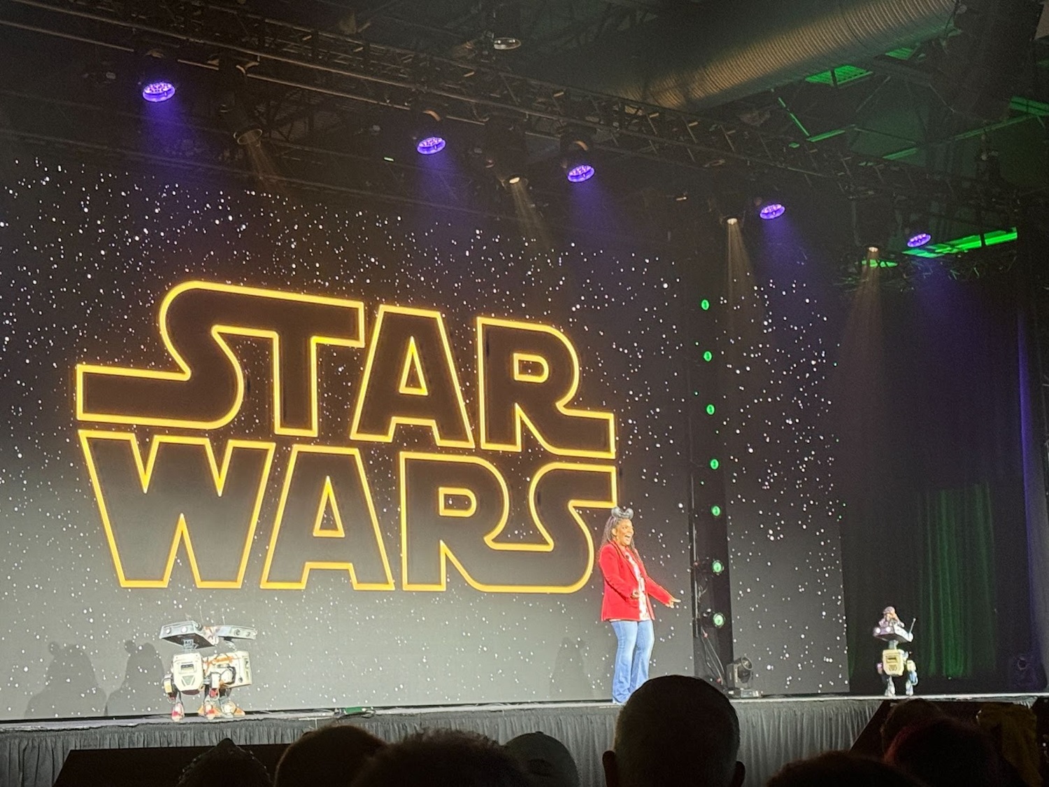 BDX droids joined Yvette Nicole Brown on stage to usher in the Lucasfilm portion of the showcase. Fans saw a clip from the upcoming Disney+ special LEGO Star Wars: Rebuild the Galaxy: Pieces of the Past (September 19). The sequence included Grogu, and in this alternate universe, his Mandalorian protector is none other than Lando Calrissian.