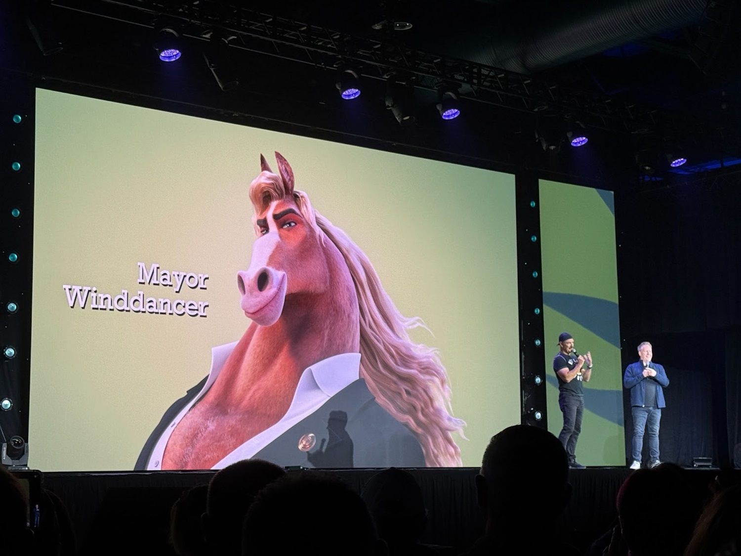 The sequel also introduces Mayor Brian Winddancer, voiced by Patrick Warburton, a former action star whose past roles include “The Neighsayer." Warburton joined the panel, delighting fans with variations of Winddancer’s signature horse-neigh delivery.