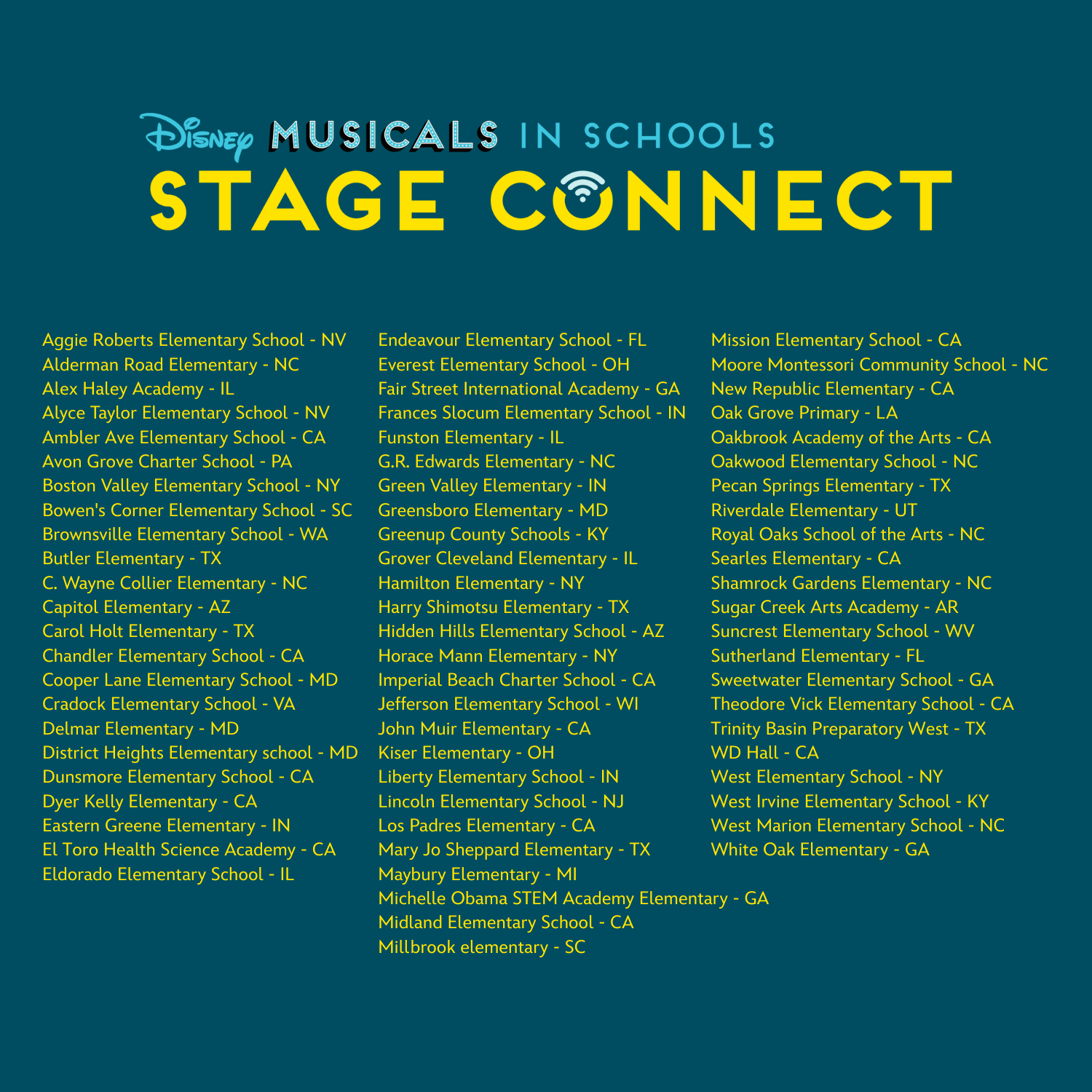 - Disney Musicals in Schools has revealed the first 71 elementary schools that have been selected from across the nation to participate in Stage Connect - a new, innovative online teacher training program that will bring the magic of musical theater to more kids and schools across the United States.