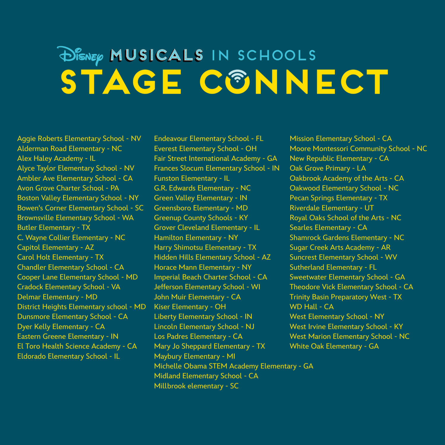 - Disney Musicals in Schools has revealed the first 71 elementary schools that have been selected from across the nation to participate in Stage Connect - a new, innovative online teacher training program that will bring the magic of musical theater to more kids and schools across the United States.