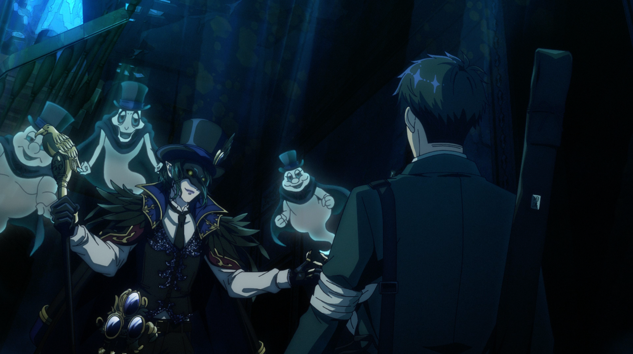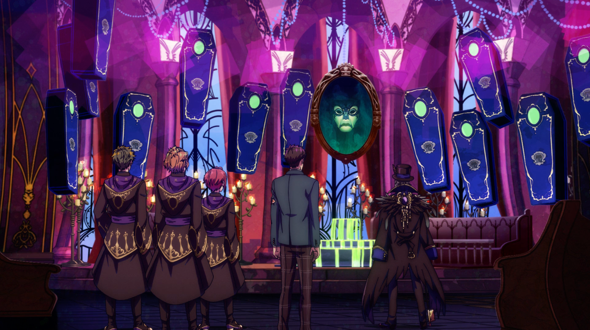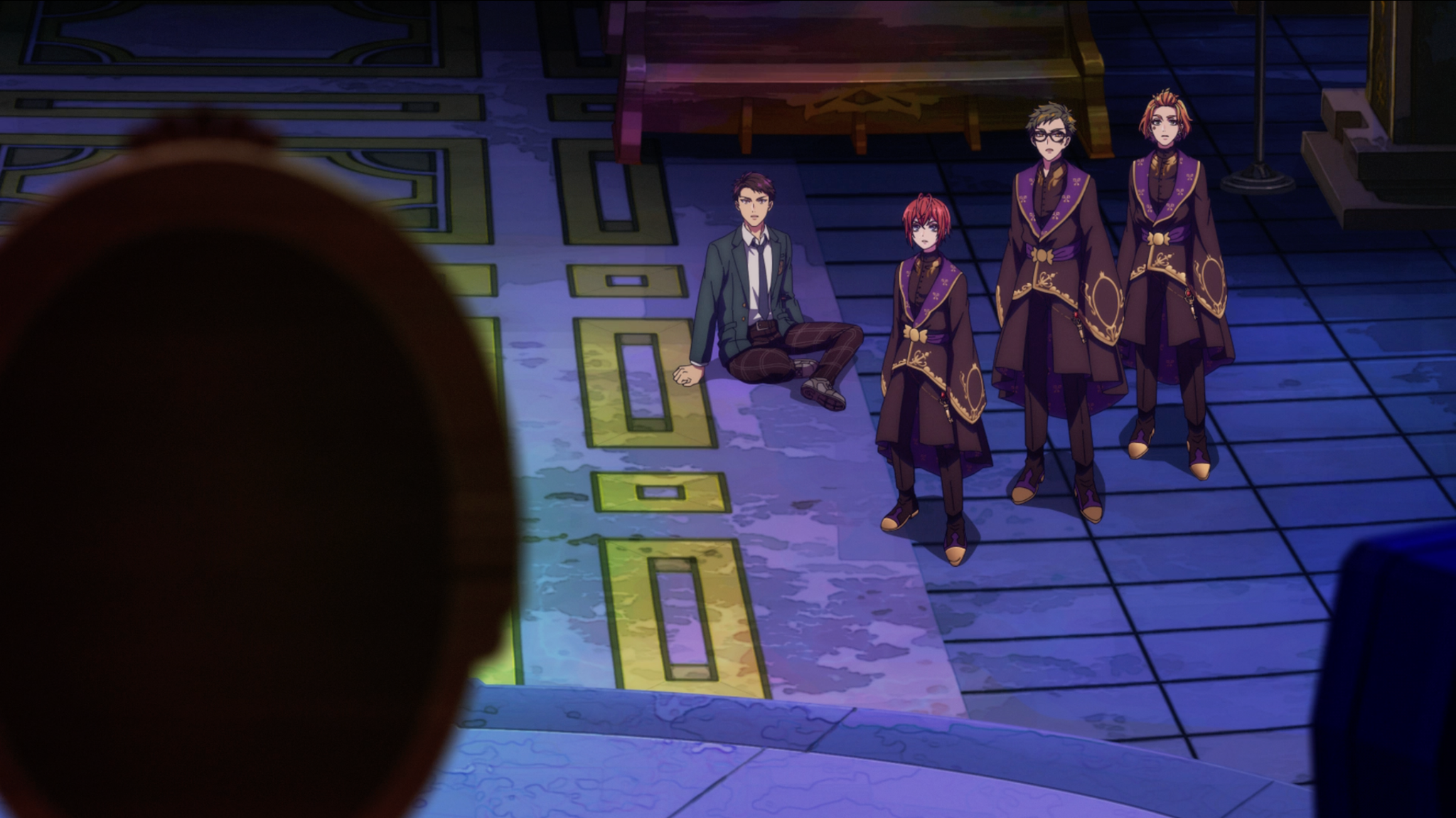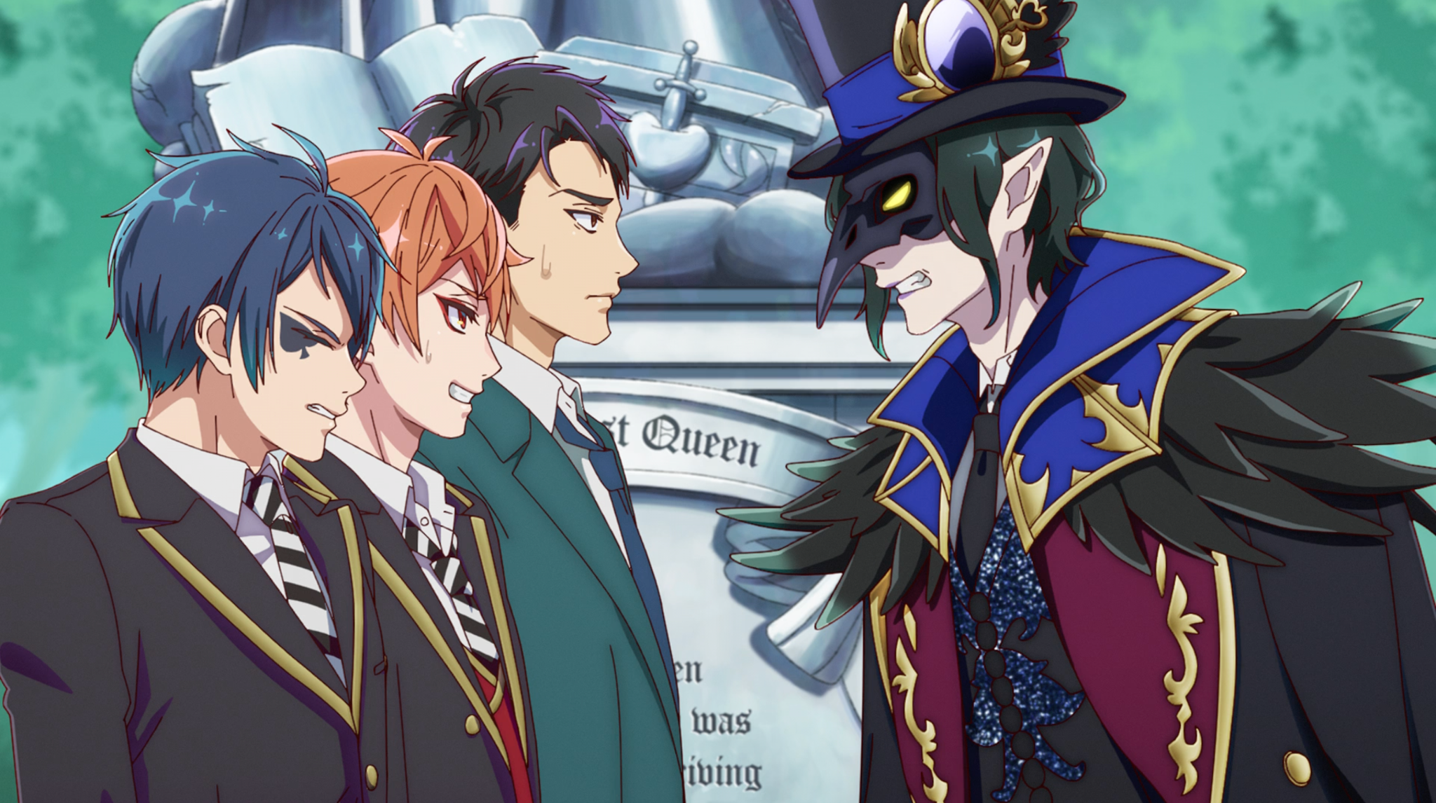 Heartslabyul House’s Headwarden, Riddle Rosehearts (Natsuki Hanae/Paul Castro Jr.), holds Yuken Enma (Yōhei Azakami/Jonathon Ha) at wandpoint in the Mirror Chamber. “Your head will roll,” Riddle vows. Thankfully, Vice Housewarden Trey Clover (Ryōta Suzuki/Johnny Yong Bosch) talks some sense into Riddle, rationalizing that Yuken is new to Night Raven College and can’t be expected to know the rules. Cater Diamond (Tatsuyuki Kobayashi/Michael Sinterniklaas) joins the mediation, suggesting that Riddle let Yuken off with a warning.