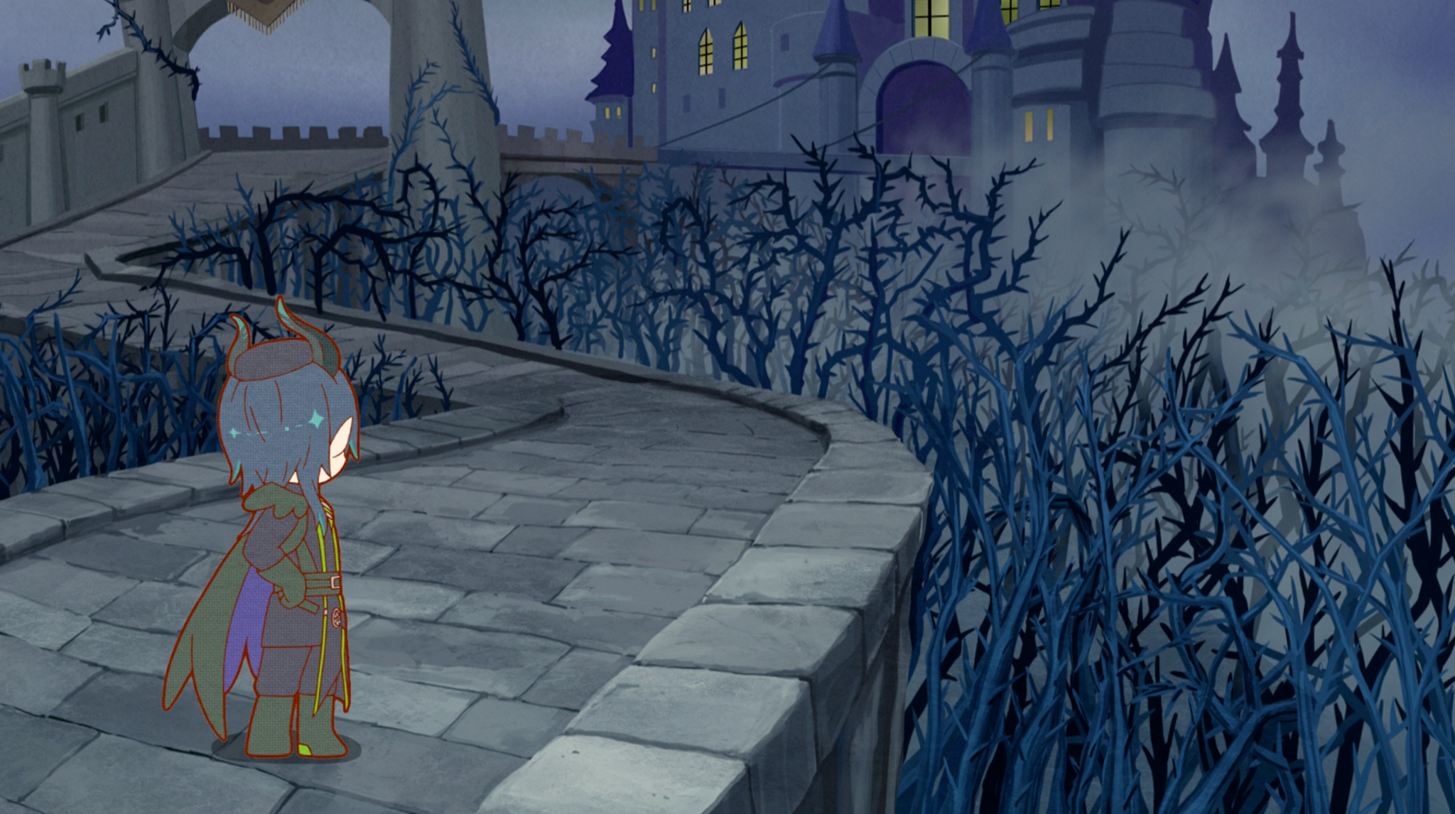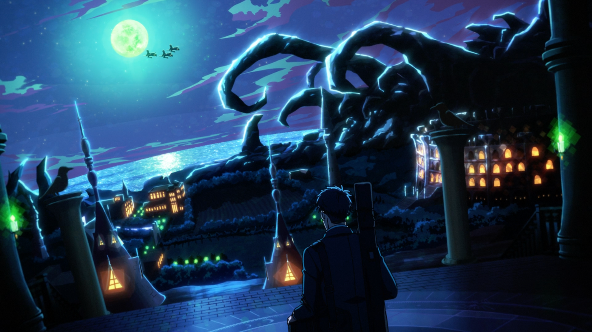 Frustrated, Yuken vows to find his own way home, leaving the Mirror Chamber and wandering the halls of Night Raven College, searching for the exit. He finds the front door and steps outside. The landscape is unlike any he’s ever seen before. Three students fly on broomsticks in the moonlit sky, complaining about how bad this year’s entrance ceremony was.