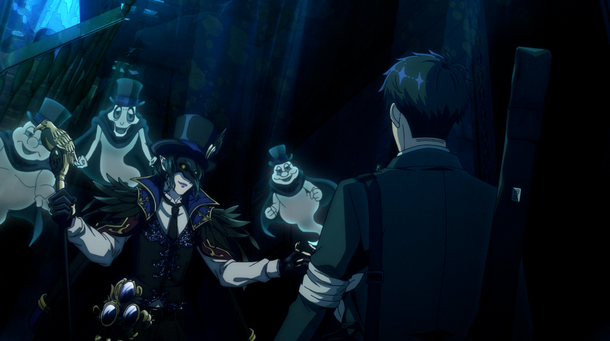The Ramshackle Dorm looks haunted from the outside, and it proves to be legitimately haunted inside. A chandelier shakes over Yuken’s head, crashing to the floor a step ahead of him. Three ghosts  (Takuma Suzuki/Danny Kramer, Nobuaki Kanemitsu/Jacob Carlson, Toshitaka Hirano/Khoi Dao) appear, trying to haunt the home’s new tenant. Instead, Yuken remains calm, introducing himself as their new housemate. The apparitions seem disappointed by this unexpected response.