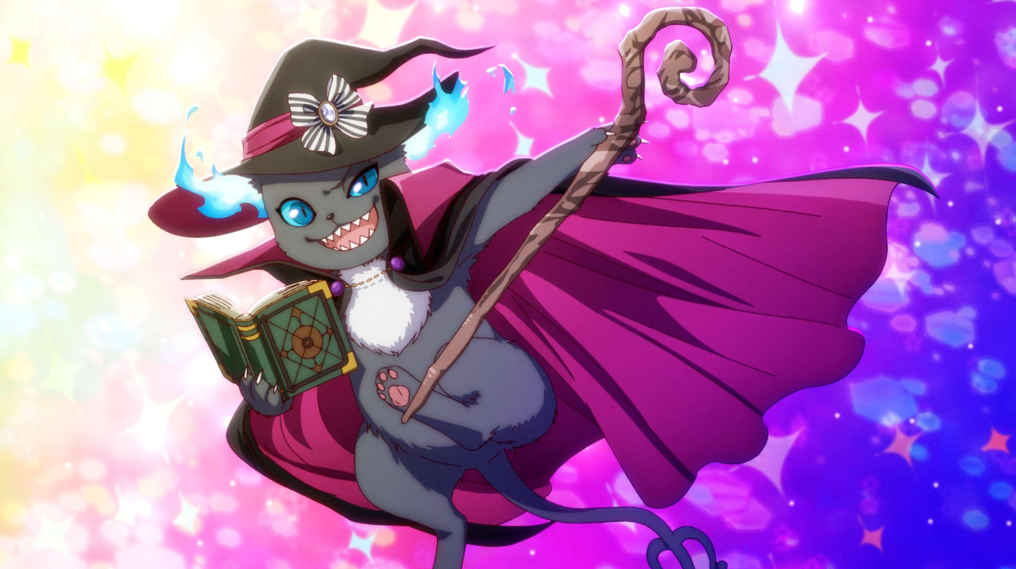 Speak of the devil, Grim (Noriaki Sugiyama/Ben Diskin) has snuck back onto campus, leaping onto Ace’s head in response to his mockery. “You won’t catch me doing any stupid chores,” the cat-like creature brags. Grim is mad that Yuken is still around, under the assumption that he’s hogging an enrollment spot that could be his. The creature begins to charge up a fireball, but Yuken treats his broom like a kendo shinai and uses it to pin Grim to the floor, grabbing him by the scruff and asking why Grim wants to be enrolled so badly. “I’m destined to become a great magician,” Grim explains, imagining himself as a powerful sorcerer. He shares that he’s been waiting his whole life for the black carriage to come for him, and he’s done waiting. He decided to take matters into his own paws this year. “I won’t give up,” Grim vows, and Yuken turns sympathetic towards him as he’s reminded of Koito’s determination. “I understand,” he tells Grim, who seems surprised by his sympathy.