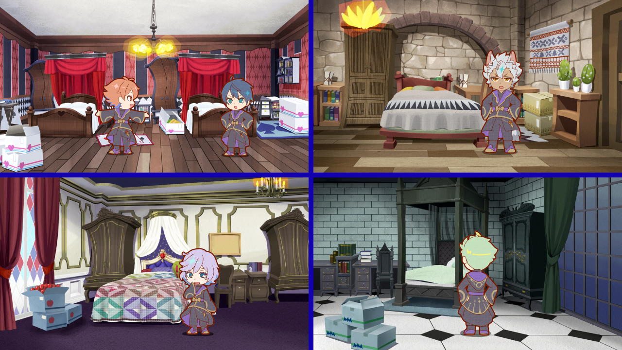 Chibi versions of first-year students get settled into their dorms in this episode’s bonus short. At Heartslabyul House, Ace Trappola selfishly hogs his dorm, despite it having two beds. Deuce Spade enters, informing him that they’re to be roommates. As Ace rolls around on his bed laughing, Deuce asks Ace to respect his study time. Ace responds by throwing a pillow in Deuce’s face.