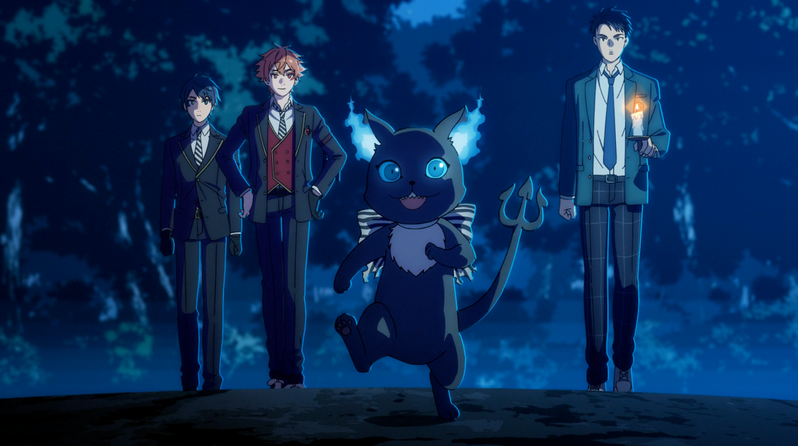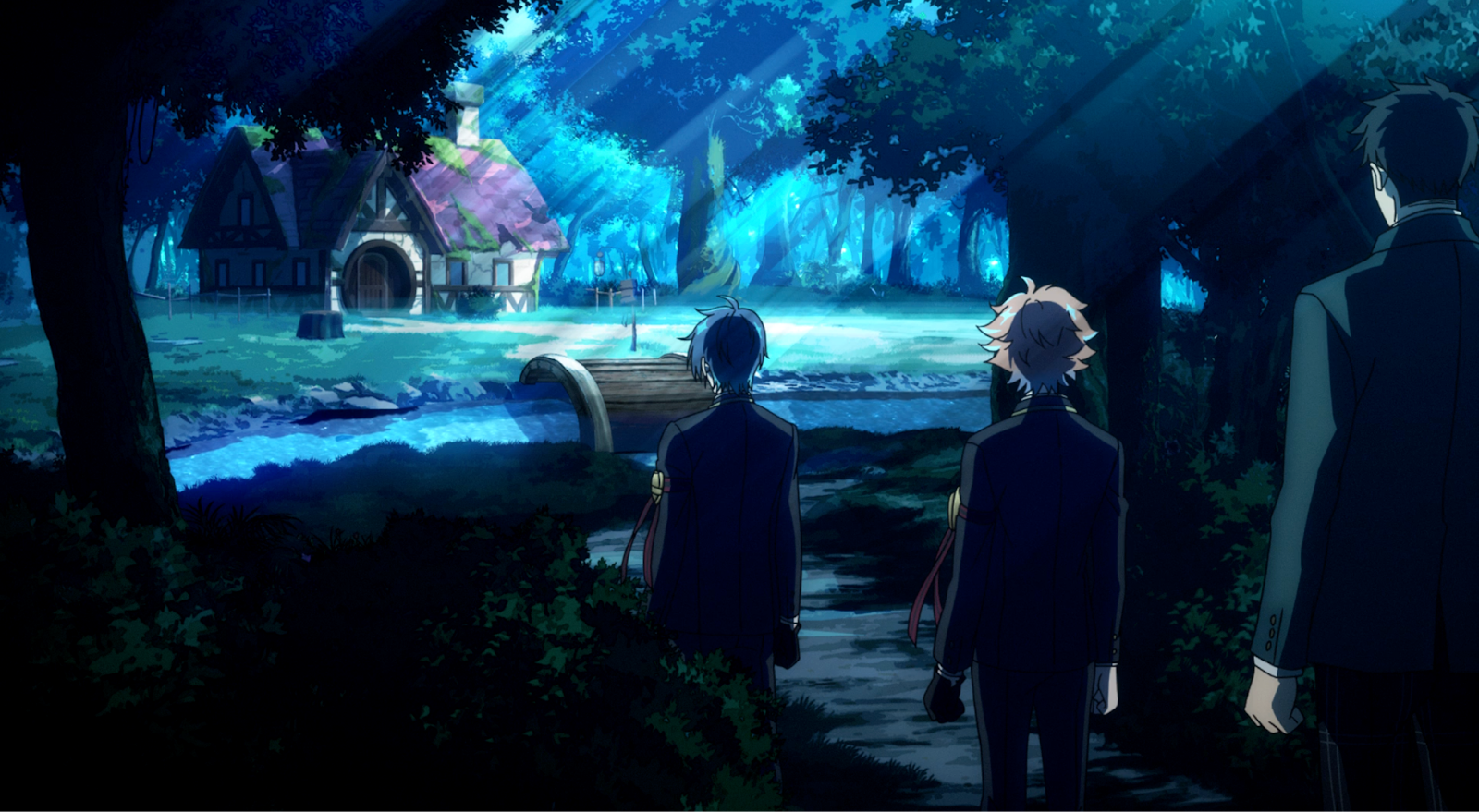 With nothing but moonlight to guide their way, Yuken Enma (Yōhei Azakami/Jonathon Ha), Ace Trappola (Seiichirō Yamashita/Max Mittelman), and Deuce Spade (Chiaki Kobayashi/Hunter McCoy) pass a small cottage by a brook on their way to the Enchanted Mine. They knock on the door to see if anybody’s home, and enter to find it seemingly abandoned. Ace wonders about its former inhabitants as he inspects a low dining table with seven chairs and small teacups. Deuce studies a cauldron in the fireplace. Yuken looks for a light they can take to the mine, finding a partially used candle but no matches. Ace and Deuce explain the particulars of learning how to use fire magic, a skill neither of them has yet to acquire. But just their luck, they were followed by Grim (Noriaki Sugiyama/Ben Diskin), who makes his presence known by blowing a small strand of blue fire on the wick, lighting it.