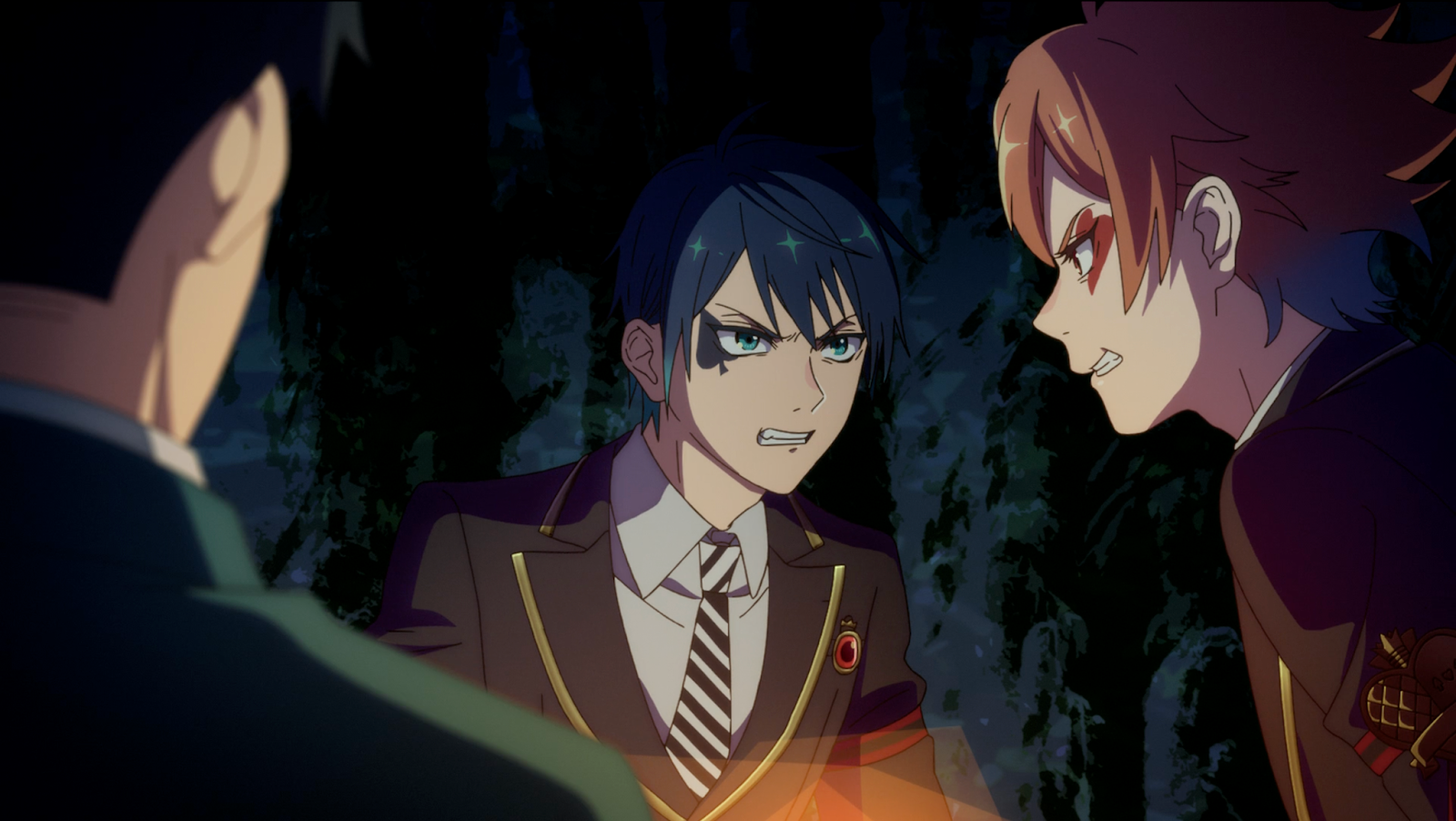 “MINE!” the Blot Monster revives as the boys start to resume their search for a magestone. Just before the monster can attack, it’s surrounded by a rush of powerful red flames that vanquish the creature for good. They turn around to see Heartslabyul House Headwarden Riddle Rosehearts (Natsuki Hanae/Paul Castro Jr.) flanked by Vice Housewarden Trey Clover (Ryōta Suzuki/Johnny Yong Bosch) and Room-Leader Cater Diamond (Tatsuyuki Kobayashi/Michael Sinterniklaas). “That monster was barely a threat, and still you fools struggle?” Riddle scoffs.