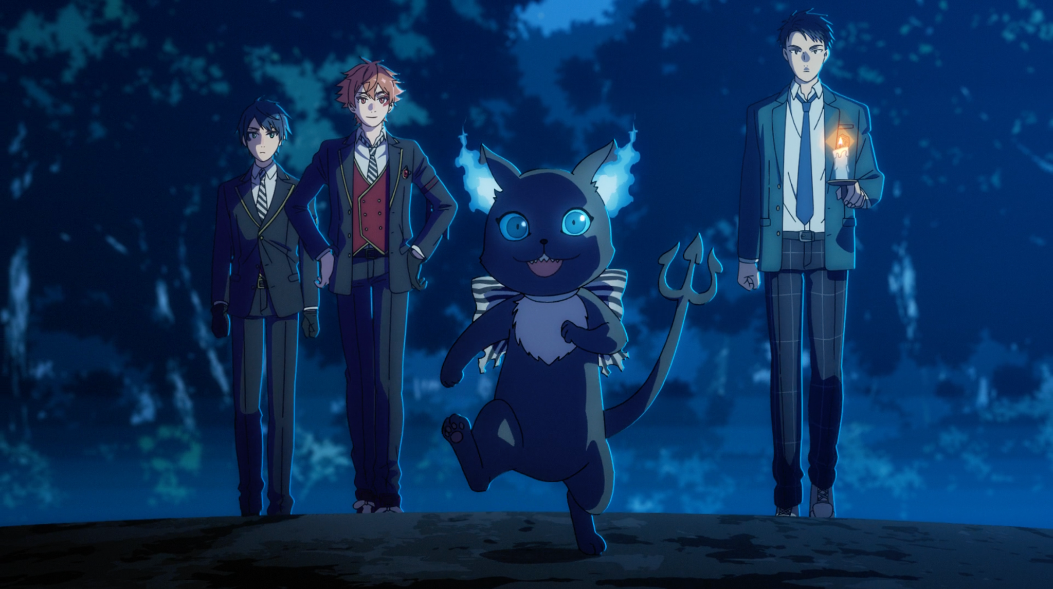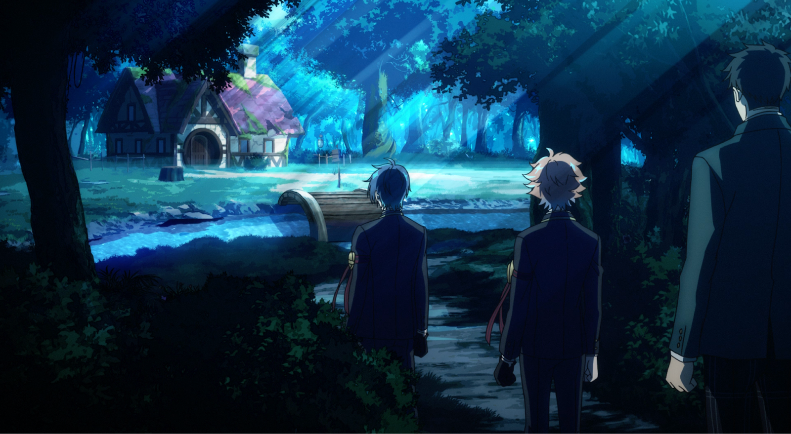 With nothing but moonlight to guide their way, Yuken Enma (Yōhei Azakami/Jonathon Ha), Ace Trappola (Seiichirō Yamashita/Max Mittelman), and Deuce Spade (Chiaki Kobayashi/Hunter McCoy) pass a small cottage by a brook on their way to the Enchanted Mine. They knock on the door to see if anybody’s home, and enter to find it seemingly abandoned. Ace wonders about its former inhabitants as he inspects a low dining table with seven chairs and small teacups. Deuce studies a cauldron in the fireplace. Yuken looks for a light they can take to the mine, finding a partially used candle but no matches. Ace and Deuce explain the particulars of learning how to use fire magic, a skill neither of them has yet to acquire. But just their luck, they were followed by Grim (Noriaki Sugiyama/Ben Diskin), who makes his presence known by blowing a small strand of blue fire on the wick, lighting it.