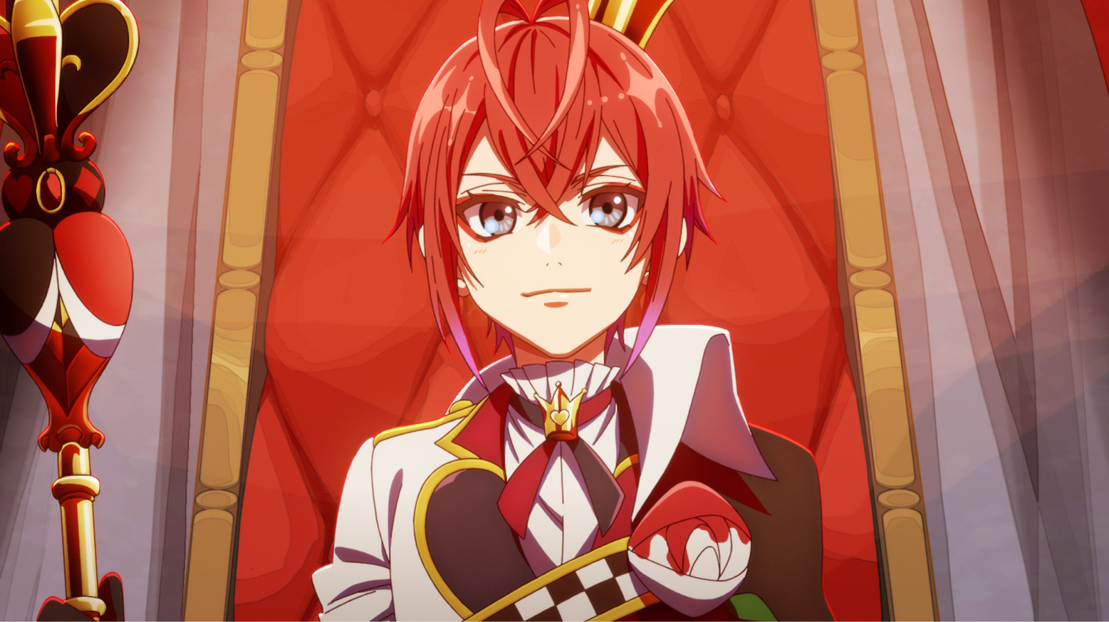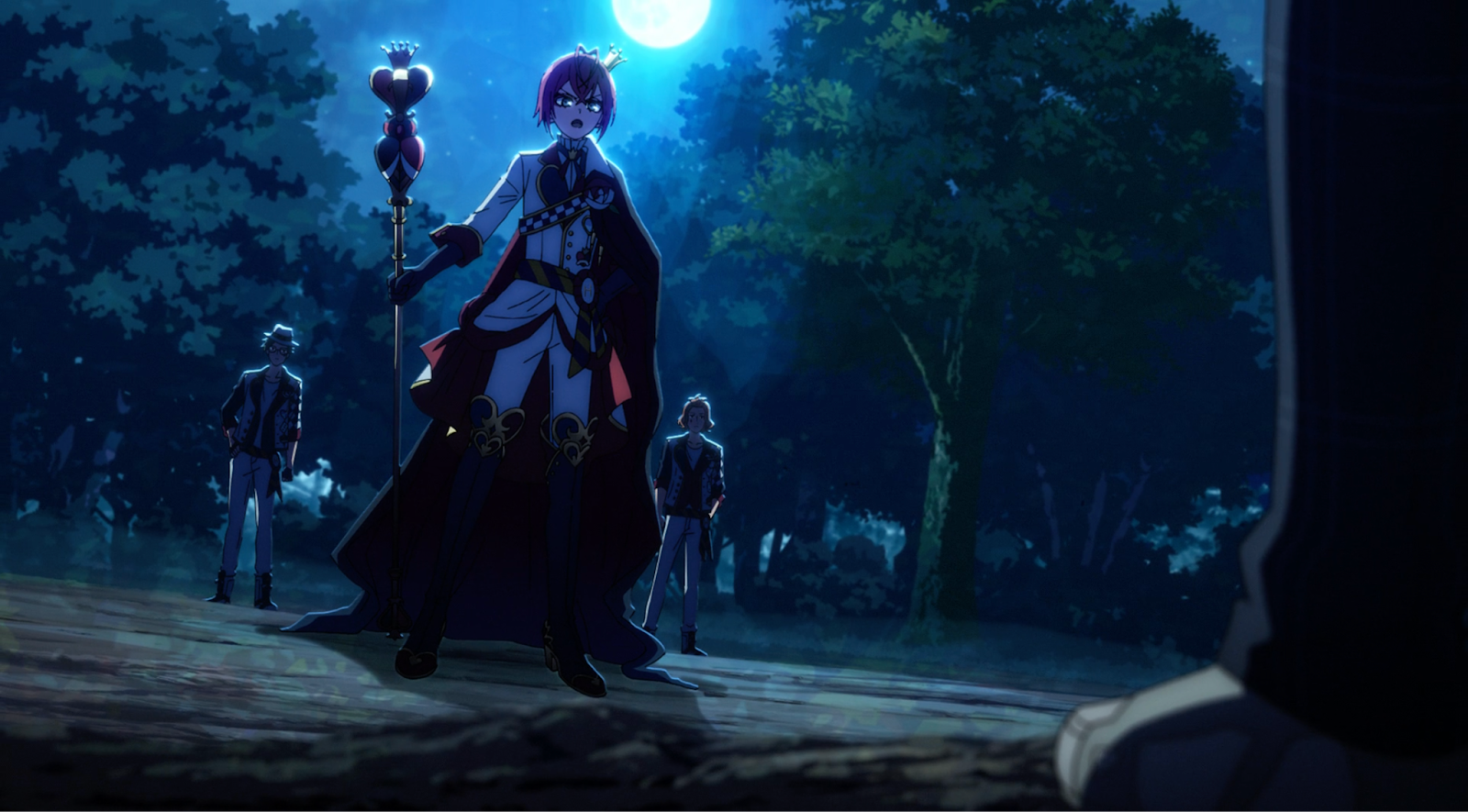 “MINE!” the Blot Monster revives as the boys start to resume their search for a magestone. Just before the monster can attack, it’s surrounded by a rush of powerful red flames that vanquish the creature for good. They turn around to see Heartslabyul House Headwarden Riddle Rosehearts (Natsuki Hanae/Paul Castro Jr.) flanked by Vice Housewarden Trey Clover (Ryōta Suzuki/Johnny Yong Bosch) and Room-Leader Cater Diamond (Tatsuyuki Kobayashi/Michael Sinterniklaas). “That monster was barely a threat, and still you fools struggle?” Riddle scoffs.
