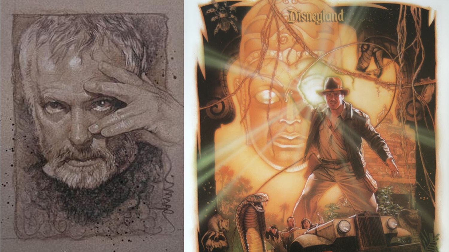 In the 1980s and 1990s, Drew Struzan designed the official logo for Lucasfilm’s in-house visual effects studios Industrial Light & Magic, and he was hired by Disneyland to illustrate the poster for the Indiana Jones Adventure: Temple of the Forbidden Eye– matching the style of posters he had provided for films in Steven Spielberg and George Lucas’s Indiana Jones franchise. Along the way he also provided art for innumerable books, comics, home media releases, board games, and even postage stamps. In the late 1990s he created the poster art for all three movies in the Star Wars Special Editions and then went on to do the same for the Star Wars prequel trilogy. Struzan retired in 2008 after contributing the poster for Indiana Jones and the Kingdom of the Crystal Skull, but returned to illustration periodically for movies like Star Wars: The Force Awakens, for which he created a special alternate poster that was distributed at D23 Expo in 2015.