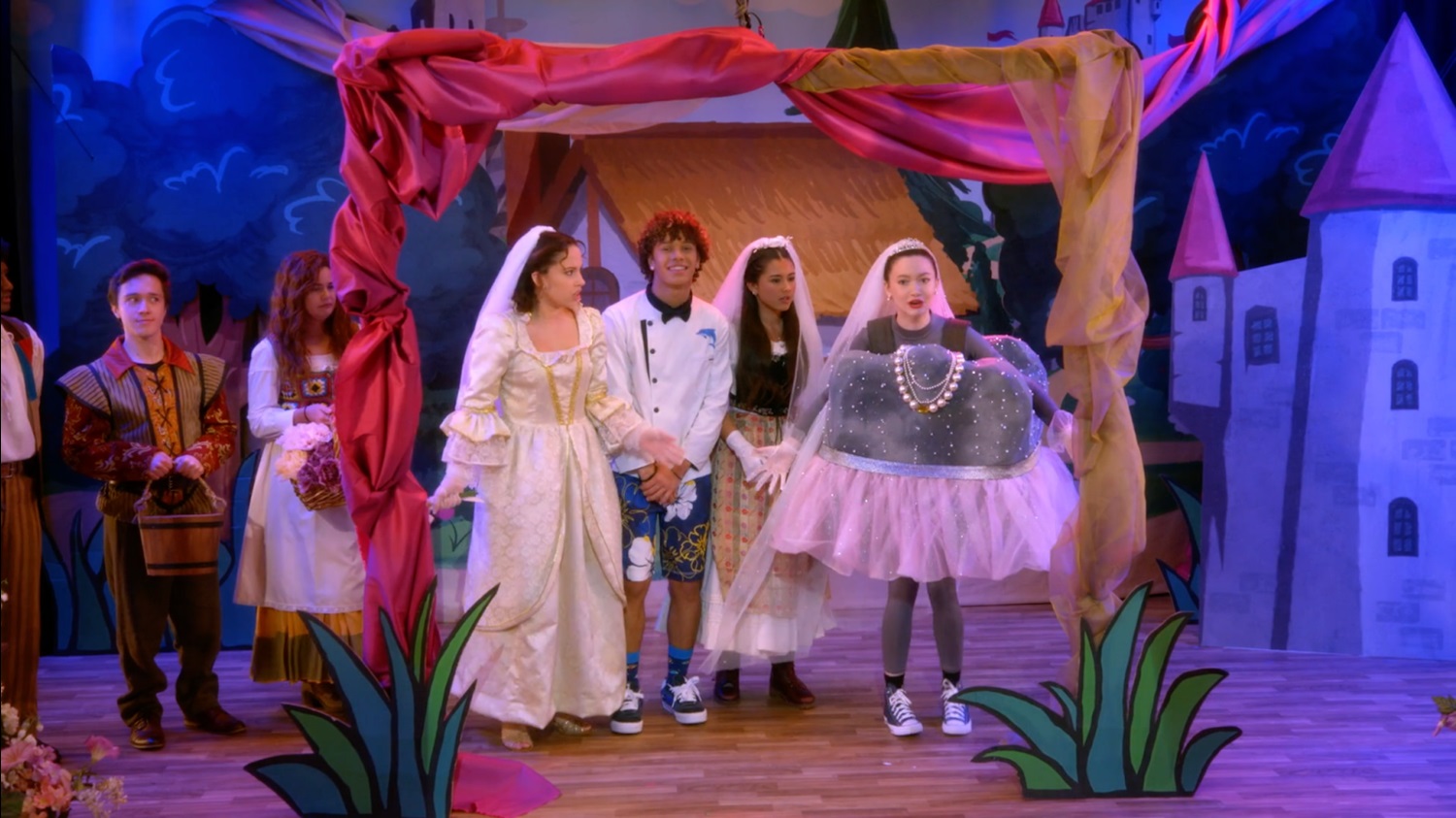 As Hazel (Jade) is falling in love with the chef/marine biologist (Lucas), Posey hands Principal Jeffers a new narration she wrote, which forces the farm girl into the scene to steal the boy from Hazel. And to make things even weirder, the rock (Tulip) enters the scene bedazzled, declaring herself a gemstone worthy of marriage. As the show builds to the intended happily ever after wedding, the chaos the three girls caused leads to the show coming to a crashing halt, literally.