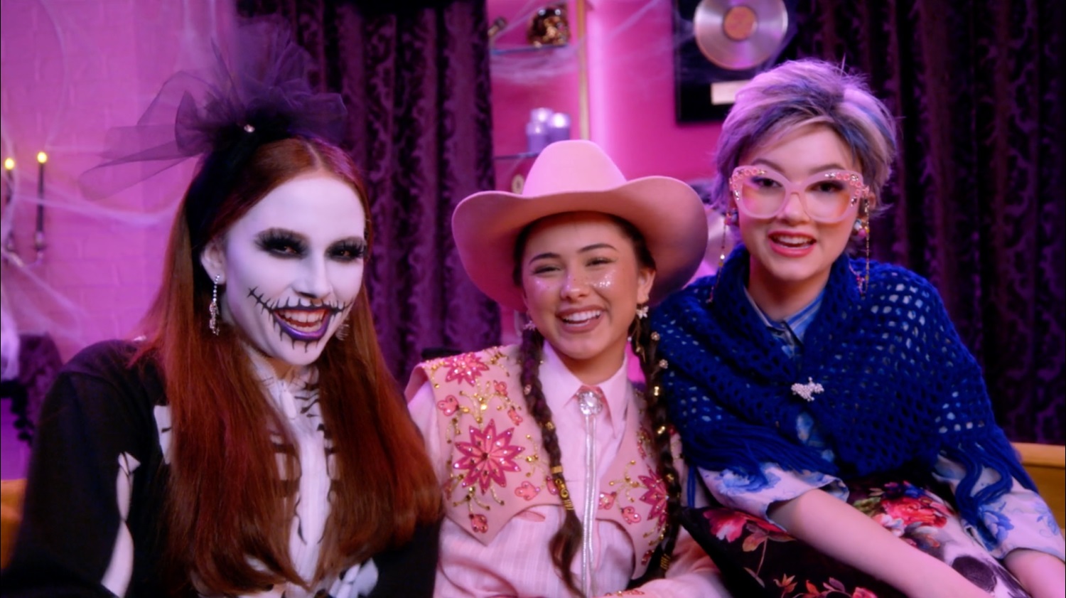 Posey (Lumi Pollack) is a cowgirl, Jade (Carmen Sanchez) is a skeleton, and Tulip (Ruby Marino) is her grandmother for Halloween this year. In honor of the occasion, the girls go online for a spooky edition of their Ask Us Anything series. “What’s the scariest thing that ever happened to you guys?" a fan asks. Setting the scene, it was the band’s first Halloween together in Freshman year when Posey and Jade feared they had lost Tulip as a friend.