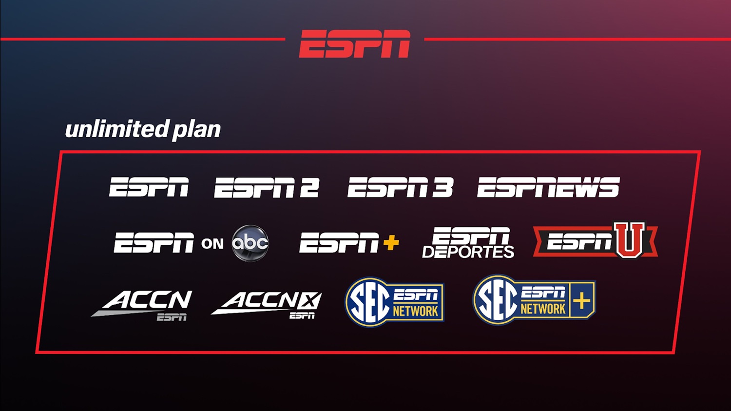 - The unlimited plan will give fans access to all of ESPN’s linear networks – ESPN, ESPN2, ESPNU, SECN, ACCN, ESPNEWS, ESPN Deportes – in addition to ESPN on ABC, ESPN+, ESPN3, SECN+, and ACCNX, covering 47,000 live events each year, on-demand replays, studio shows, original programming, and more.