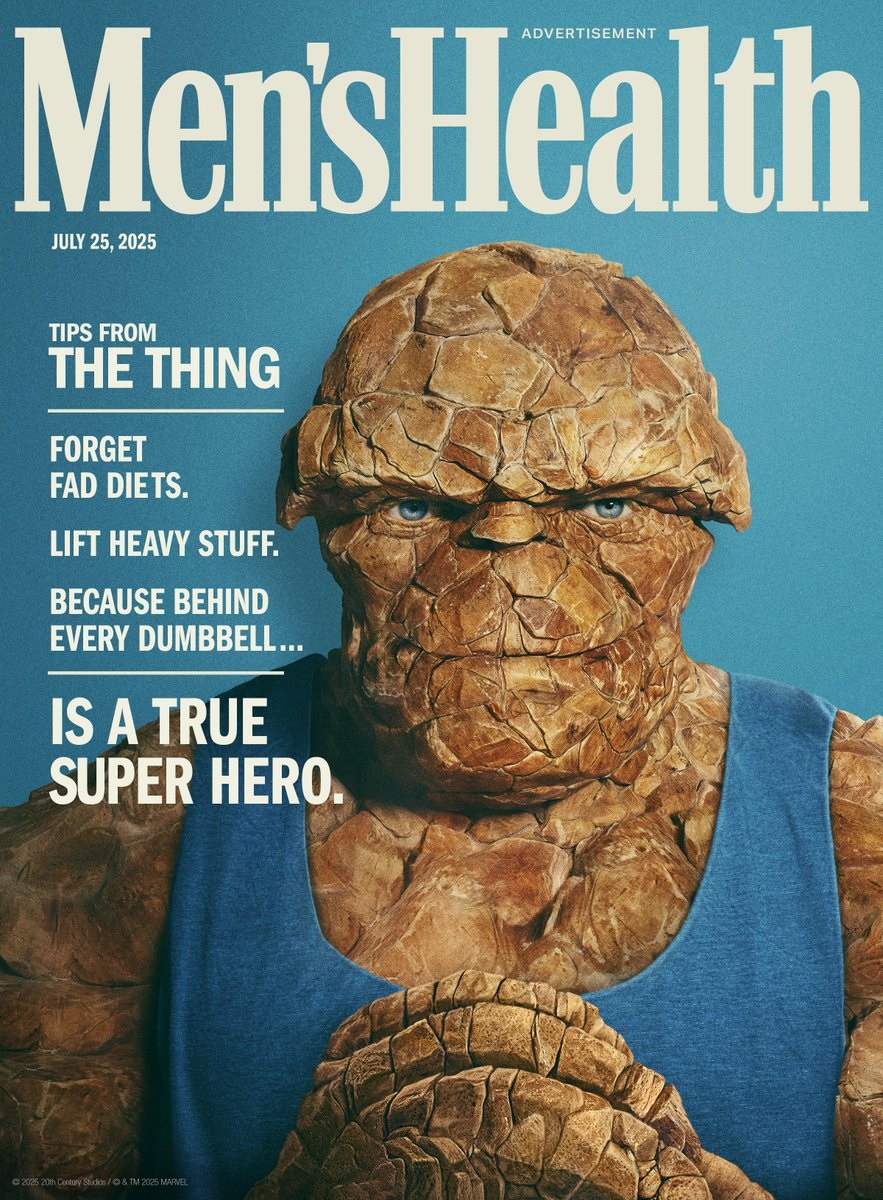 UPDATE #2 (7/16): Now Men’s Health magazine is getting in on the Fantastic Four action by featuring Ben Grimm / The Thing on a fake cover, telling readers to “lift heavy stuff":